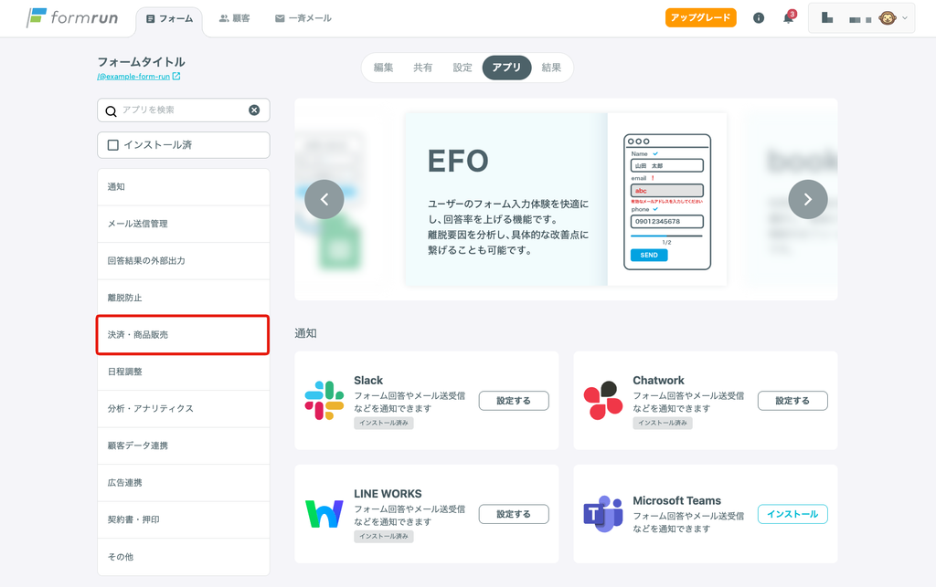PayPal連携画面またはfincode連携画面からアプリ一覧画面を開き、「決済・商品販売」を開く