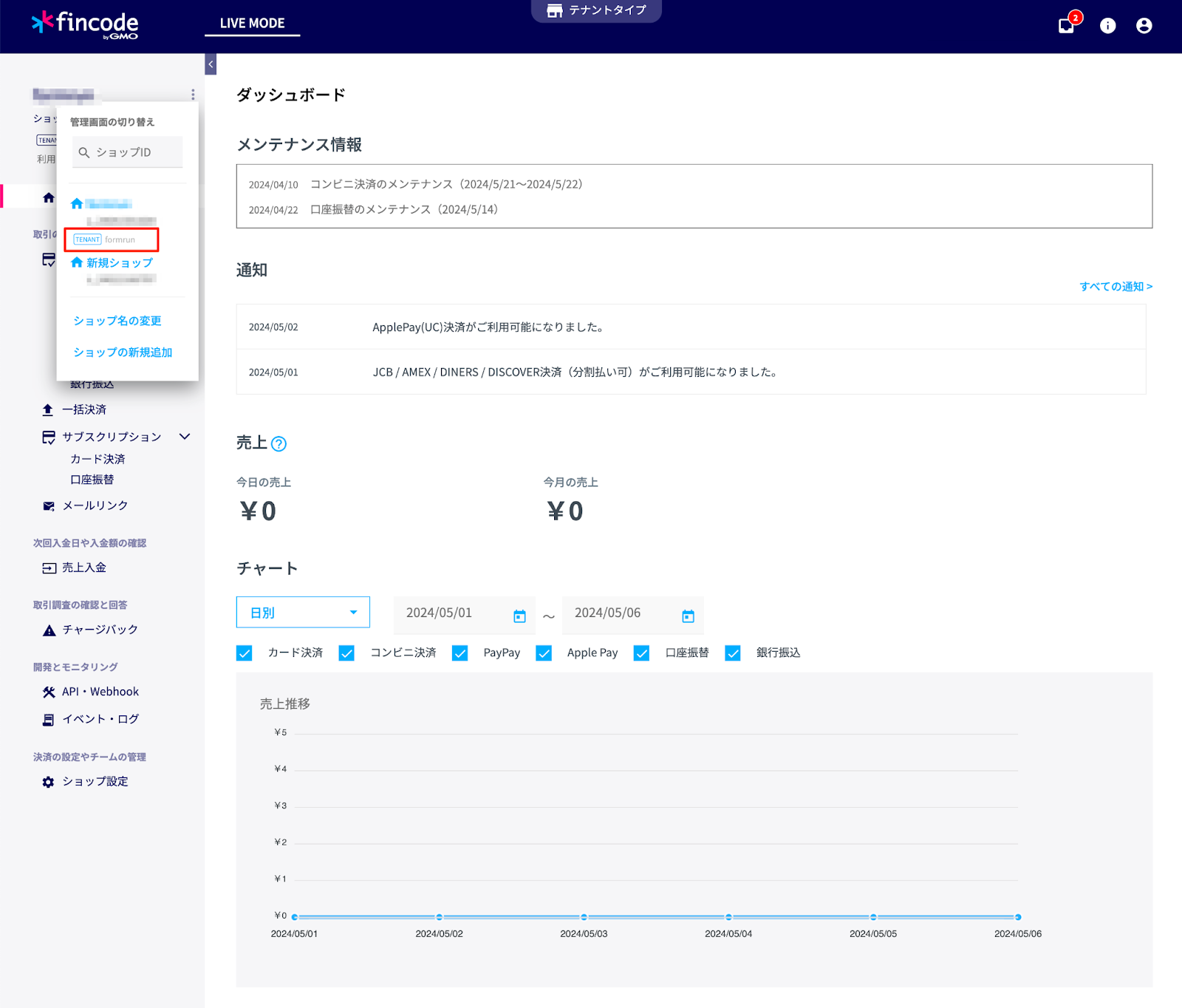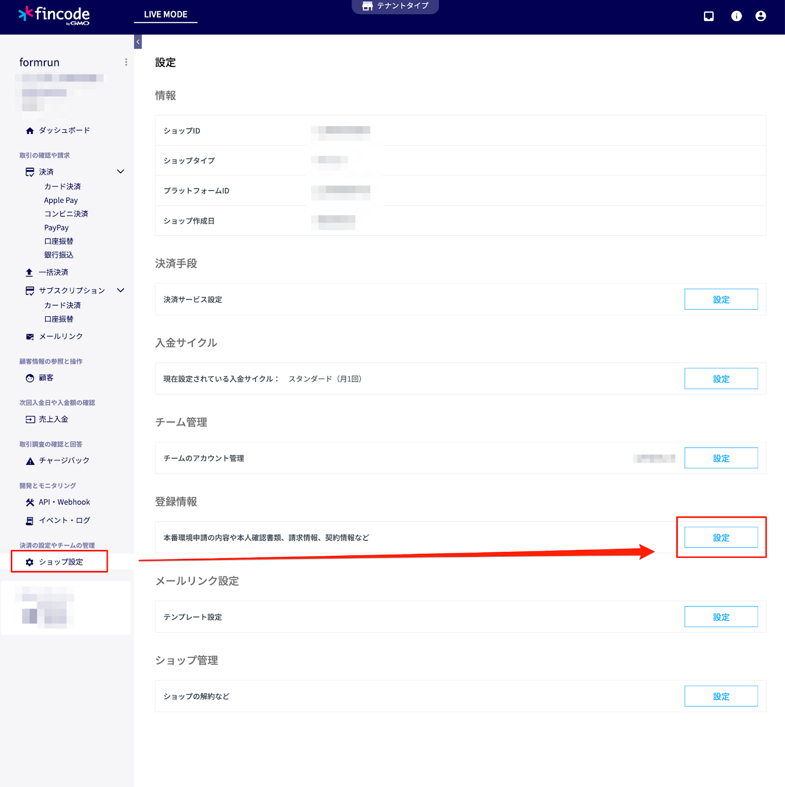 - すでにfincodeアカウントをお持ちで、ログインを行った場合、fincode管理画面左上のショップIDの下に「TENANT formrun」と表示されていることをご確認ください。