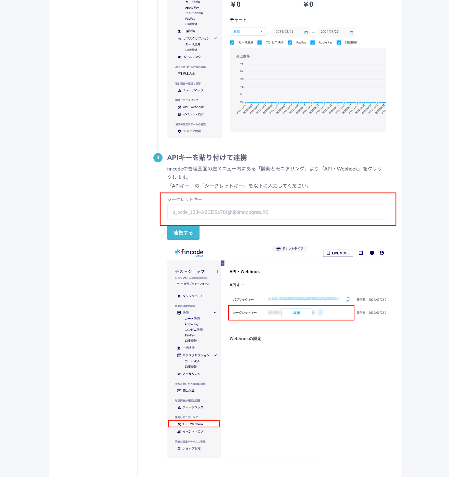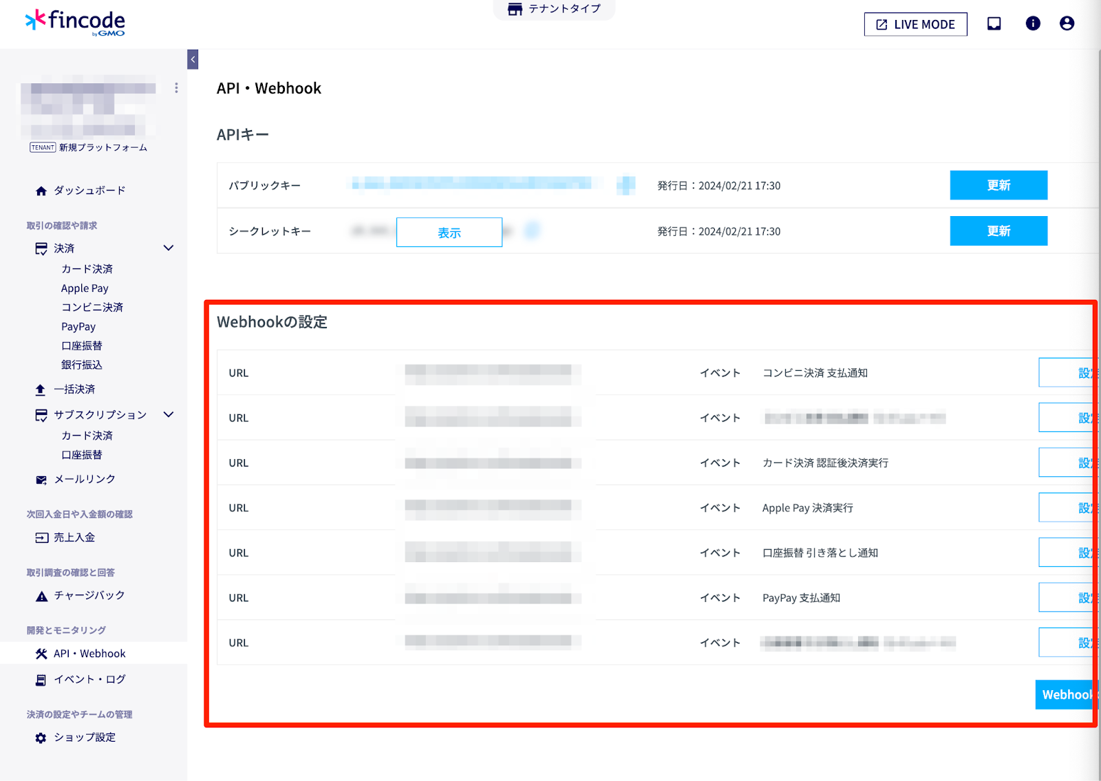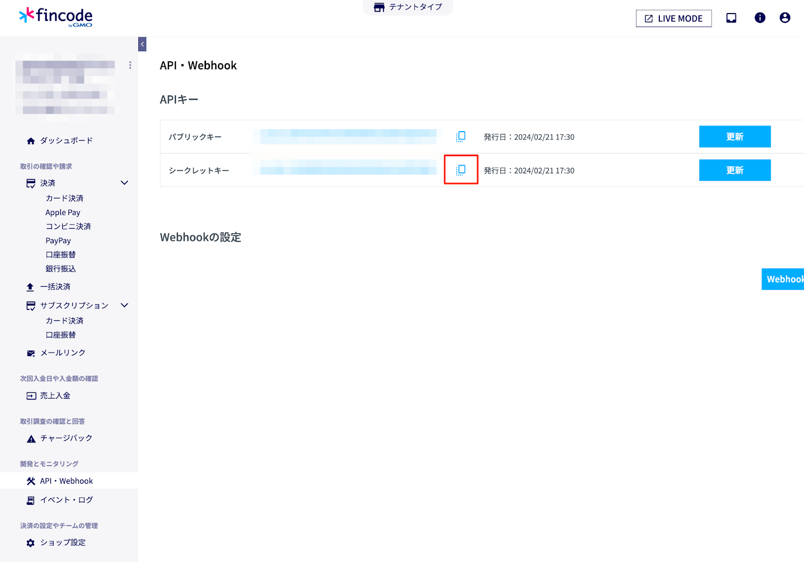 ショップIDを登録すると、fincode管理画面の「API・Webhook」画面で、APIキーが表示されるようになります。