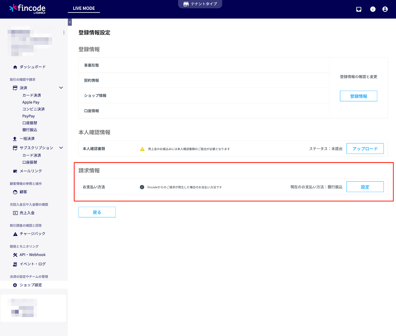 - コンビニ決済または口座振替をご利用の場合、売上が最低手数料を下回ると、売上がマイナスになります。 マイナス分の金額は、fincodeより請求されます。 請求が発生した場合は、fincode管理画面左メニューの「ショップ設定」より、登録情報の「設定」から請求情報を設定し、支払う必要があります。