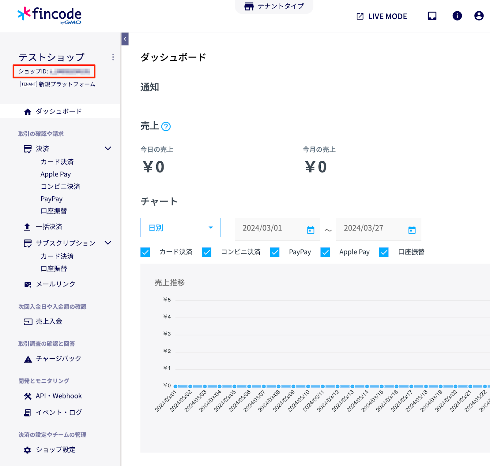 まずはfincode管理画面の左上に表示されているショップIDをコピーします。