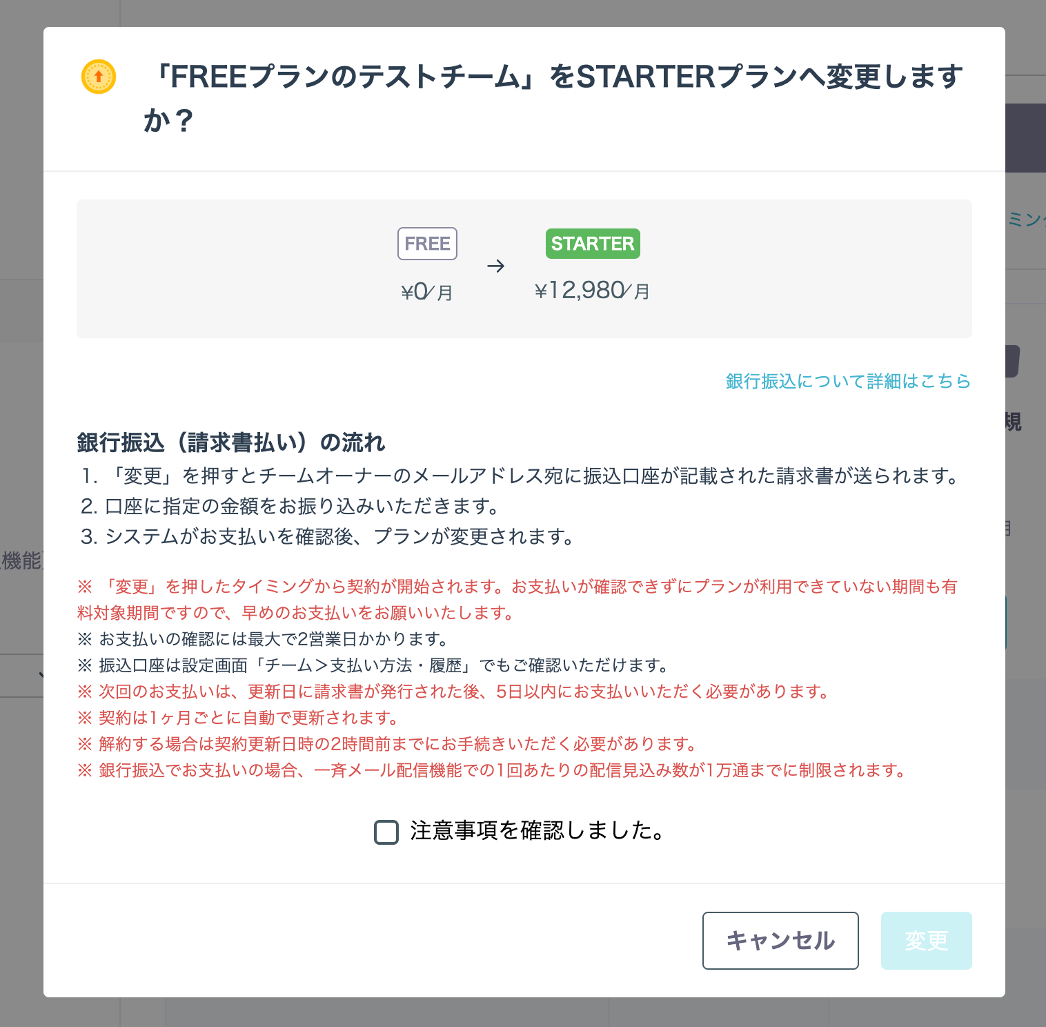 - お振込後、決済システムがお支払いを確認したタイミングで自動的にプランが切り替わる ※最大2営業日かかります