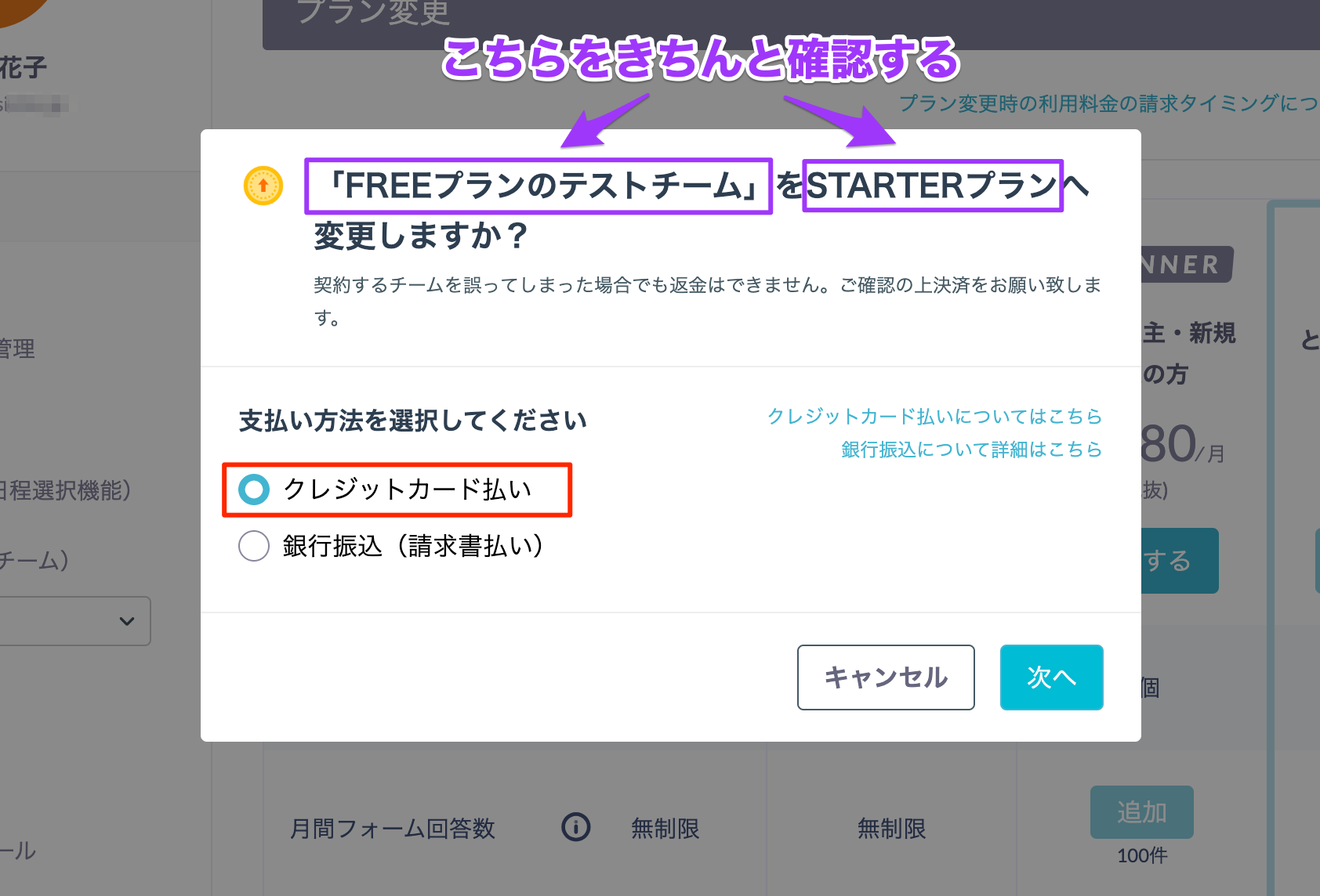 - STARTERプランまたはPROFESSIONALプランの場合、「クレジットカード払い」を選択する