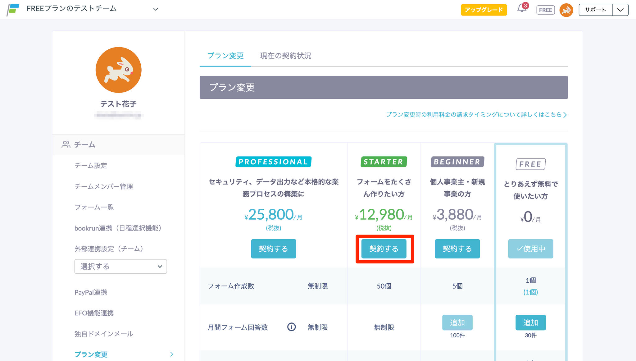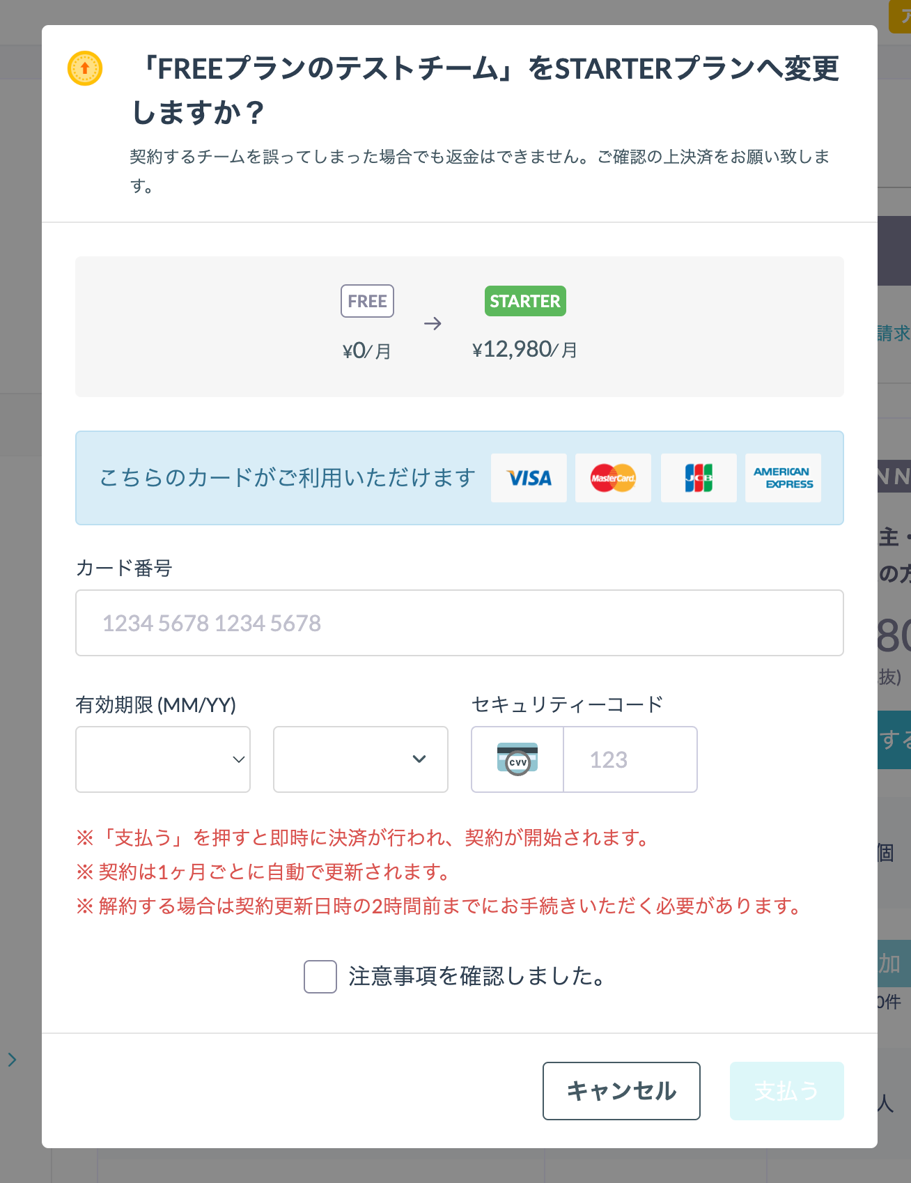 6月15日10:15にFREEプランからSTARTERプランに変更するボタンをクリックすると、「毎月15日10:15」が契約更新日時になります。