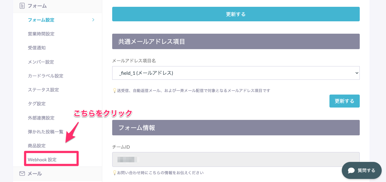 - 設定画面「フォーム>フォーム設定>Webhook 設定」をクリック