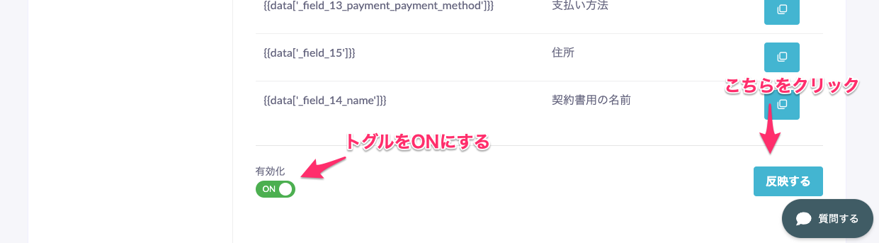 - 「有効化」のトグルをONにして、「反映する」ボタンをクリックして完了。