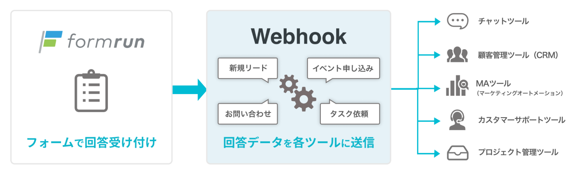 Webhook機能とは、formrun上で受け取ったデータをリアルタイムに他のサービスやアプリケーションに送信できる機能です。