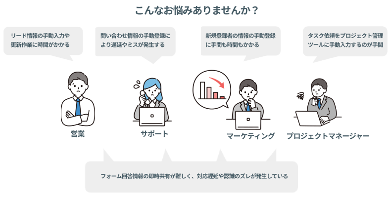| 問い合わせ管理 | 問い合わせの詳細項目のみをチャットツールに通知し、チャットツール上で即座に対応優先度の判断が可能。 |