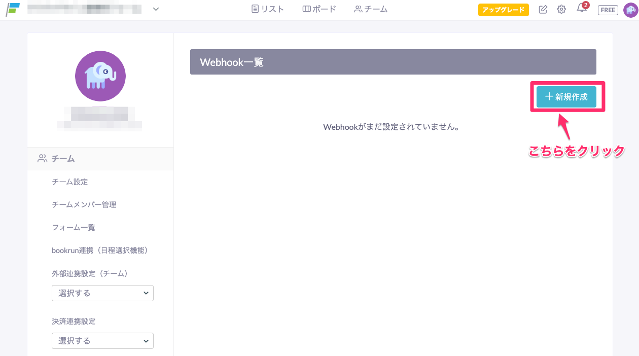 - Webhook一覧画面で「新規作成」ボタンをクリック