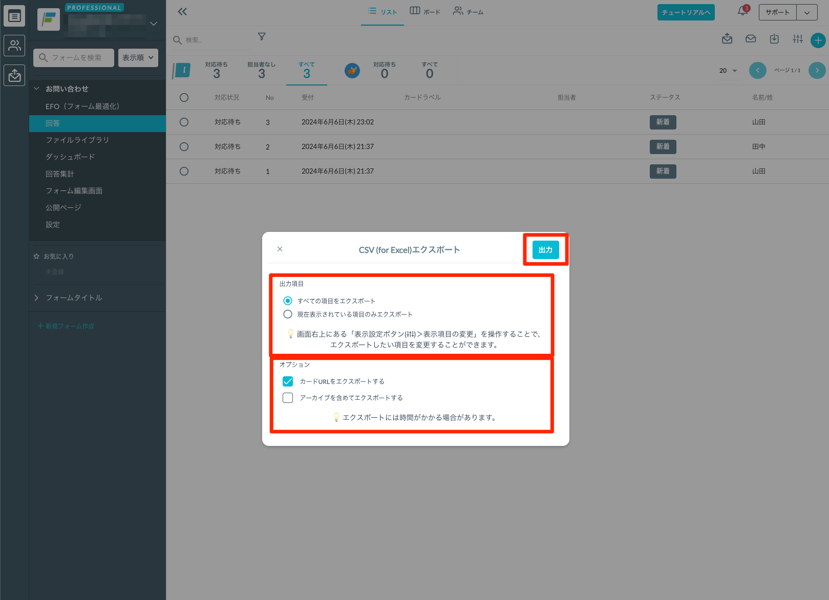 収集したフォーム回答データを出力する