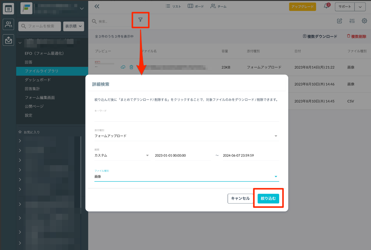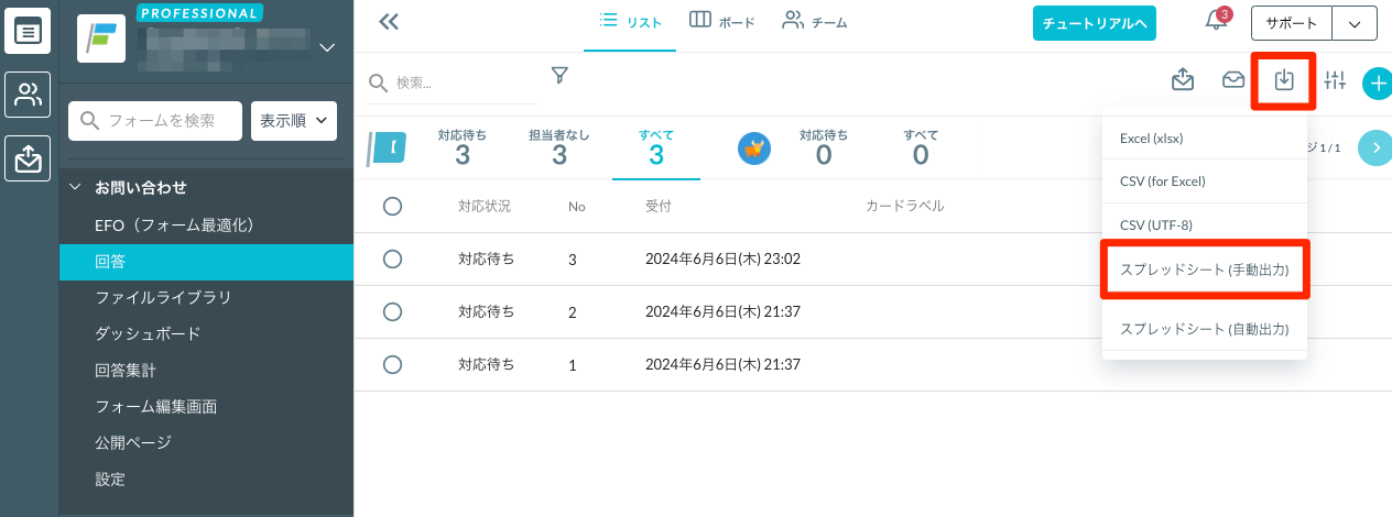 顧客情報をフォームごとに出力するCSV/Excel形式のエクスポート手順Googleスプレッドシート(手動)出力手順Googleスプレッドシート(自動)出力手順顧客情報のうち、添付ファイルのみをフォームごとに出力するすべて一括で出力する条件で絞り込んで出力するチームに存在する顧客情報をまとめて出力する