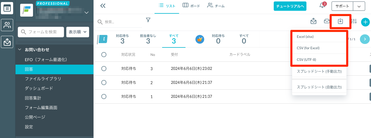 フォームの回答情報をCSV/Excel形式に出力できる機能です。