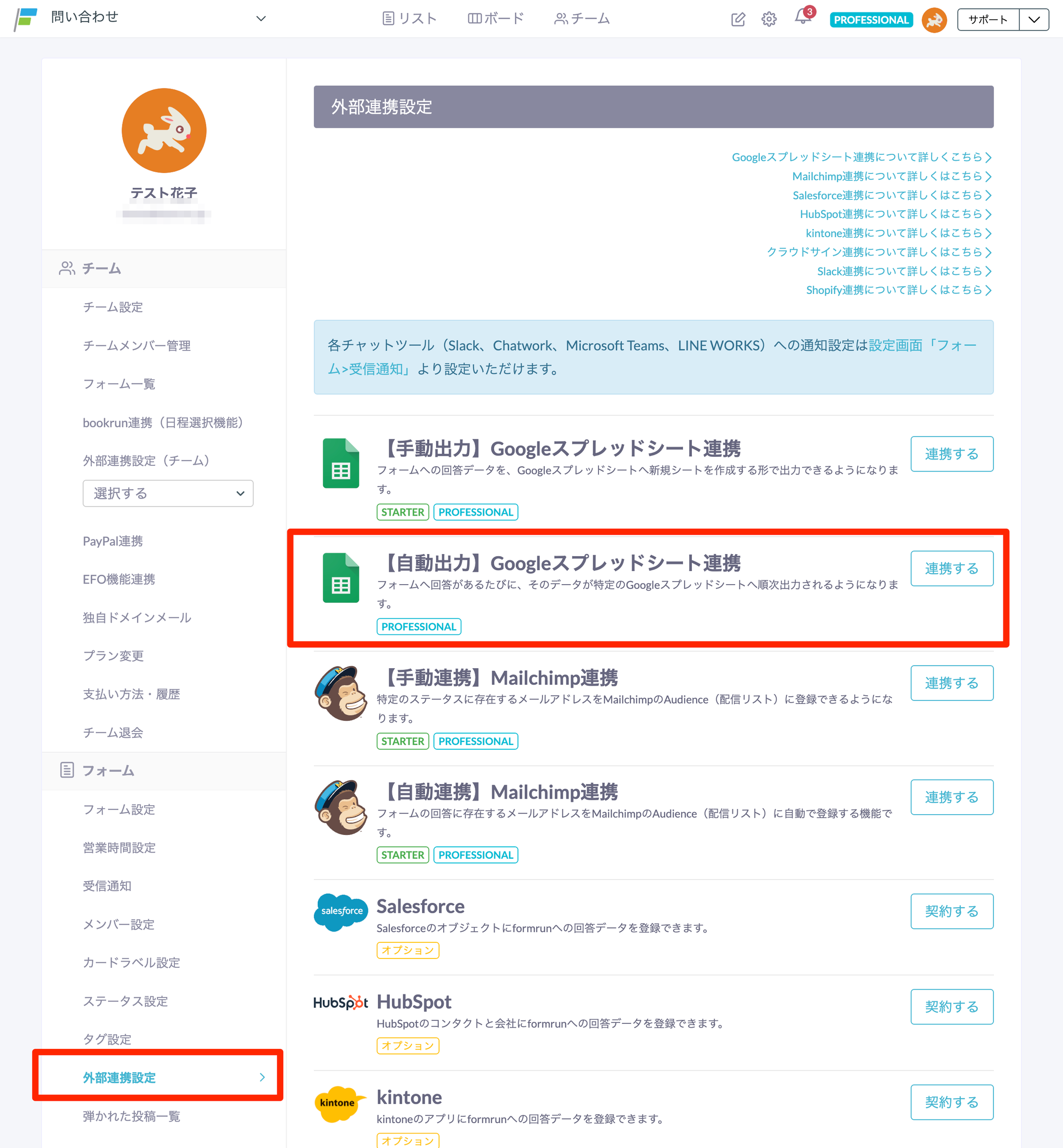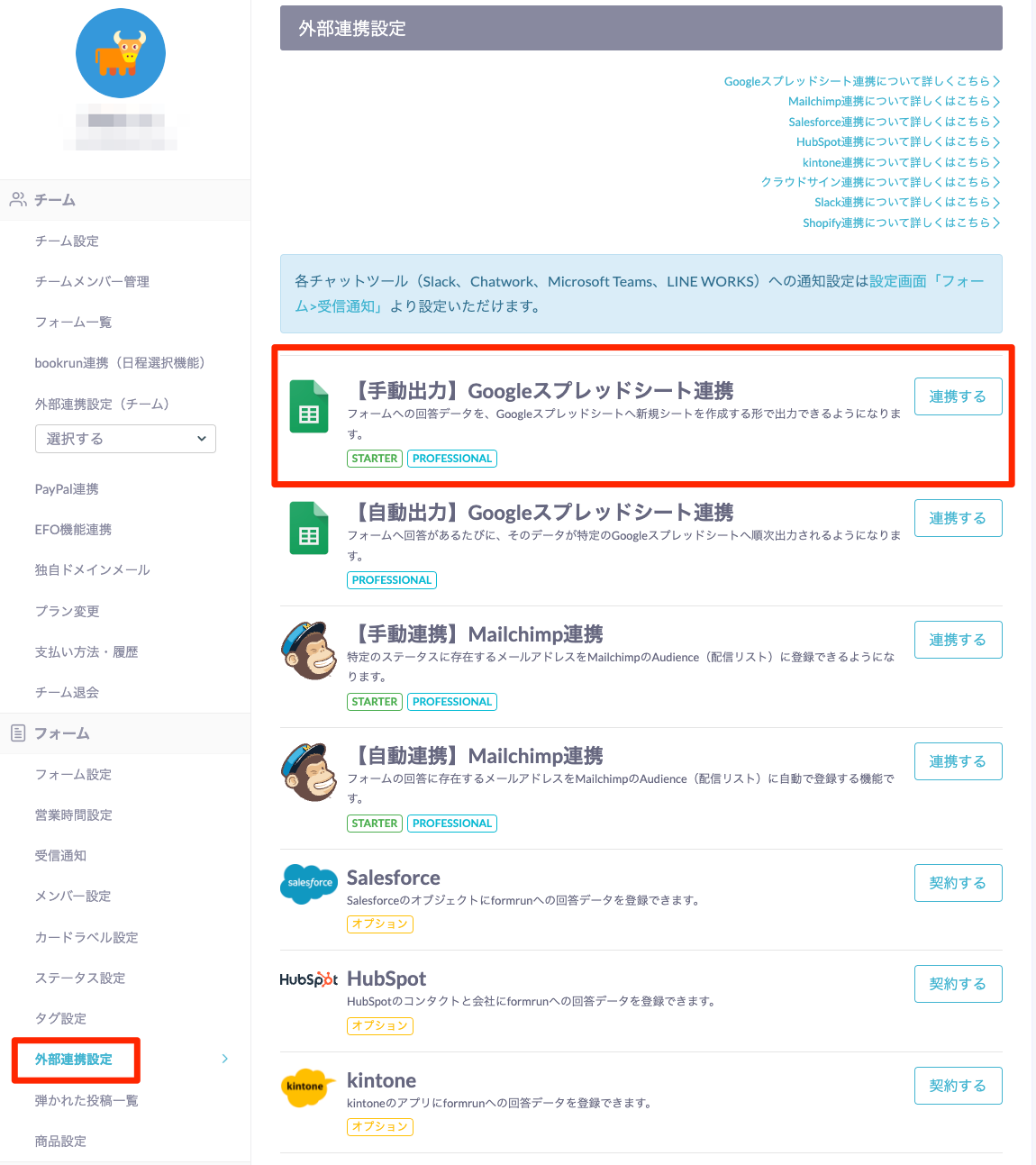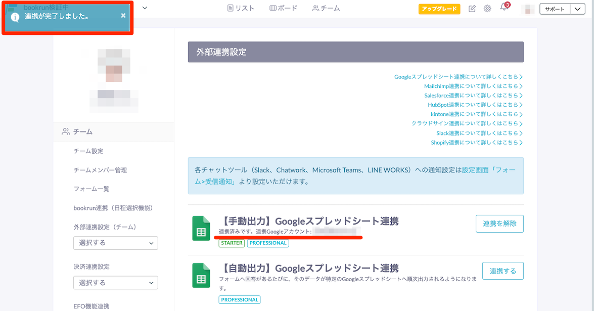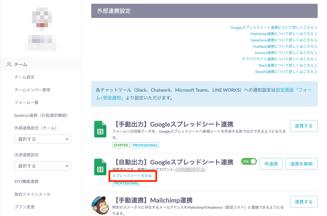 - 設定画面「フォーム>外部連携設定」に遷移し、【自動出力】Googleスプレッドシート連携」の「連携する」をクリック