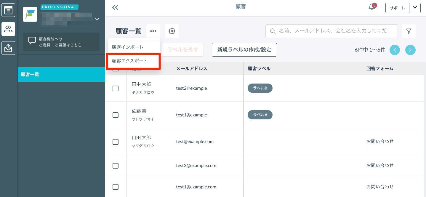 - 顧客一覧の「・・・」より「顧客エクスポート」をクリック