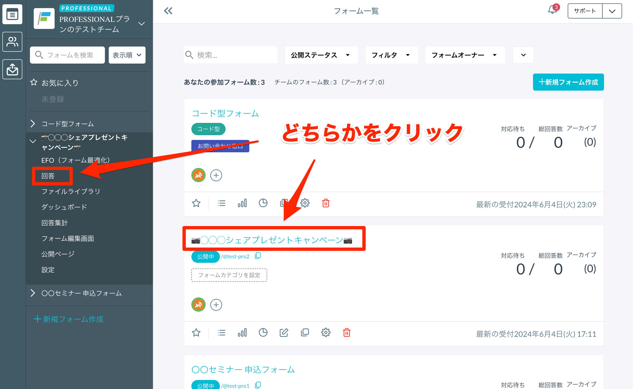 フォーム一覧画面でフォーム名をクリックするか、サイドバーの「回答」をクリックするかで遷移できます。