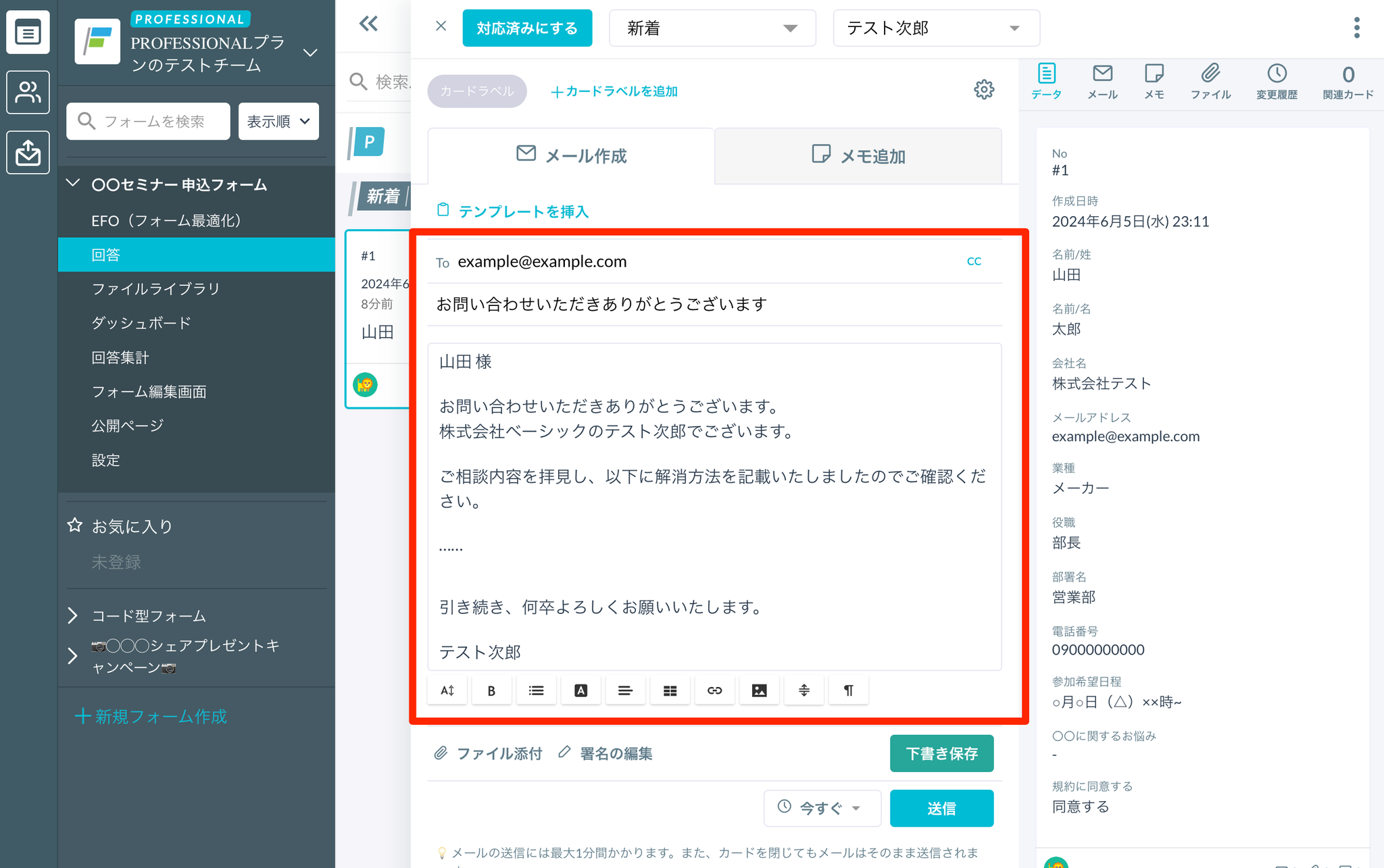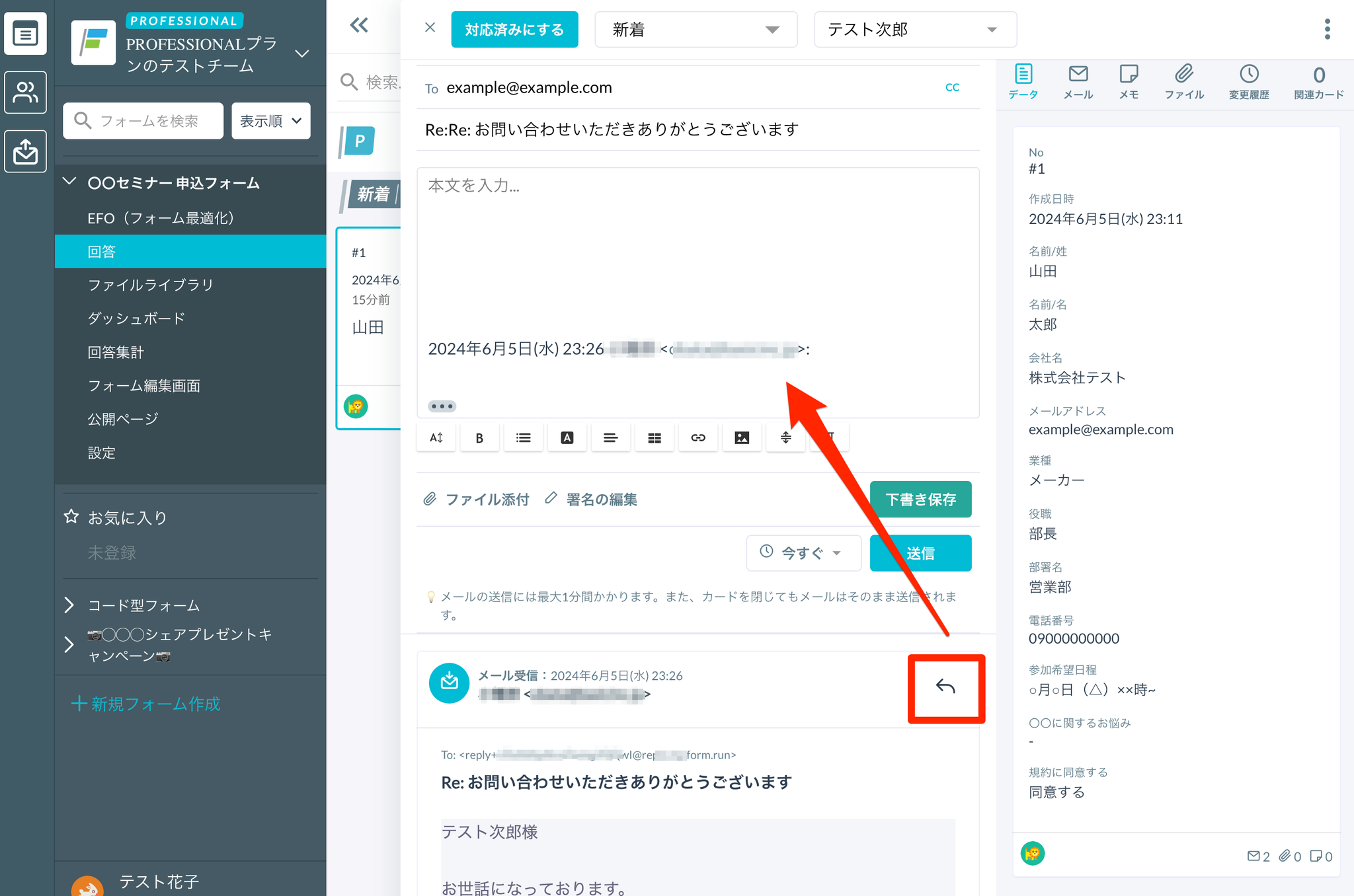 「返信」ボタンをクリックすると、フォーム回答者の返信内容を引用できます。