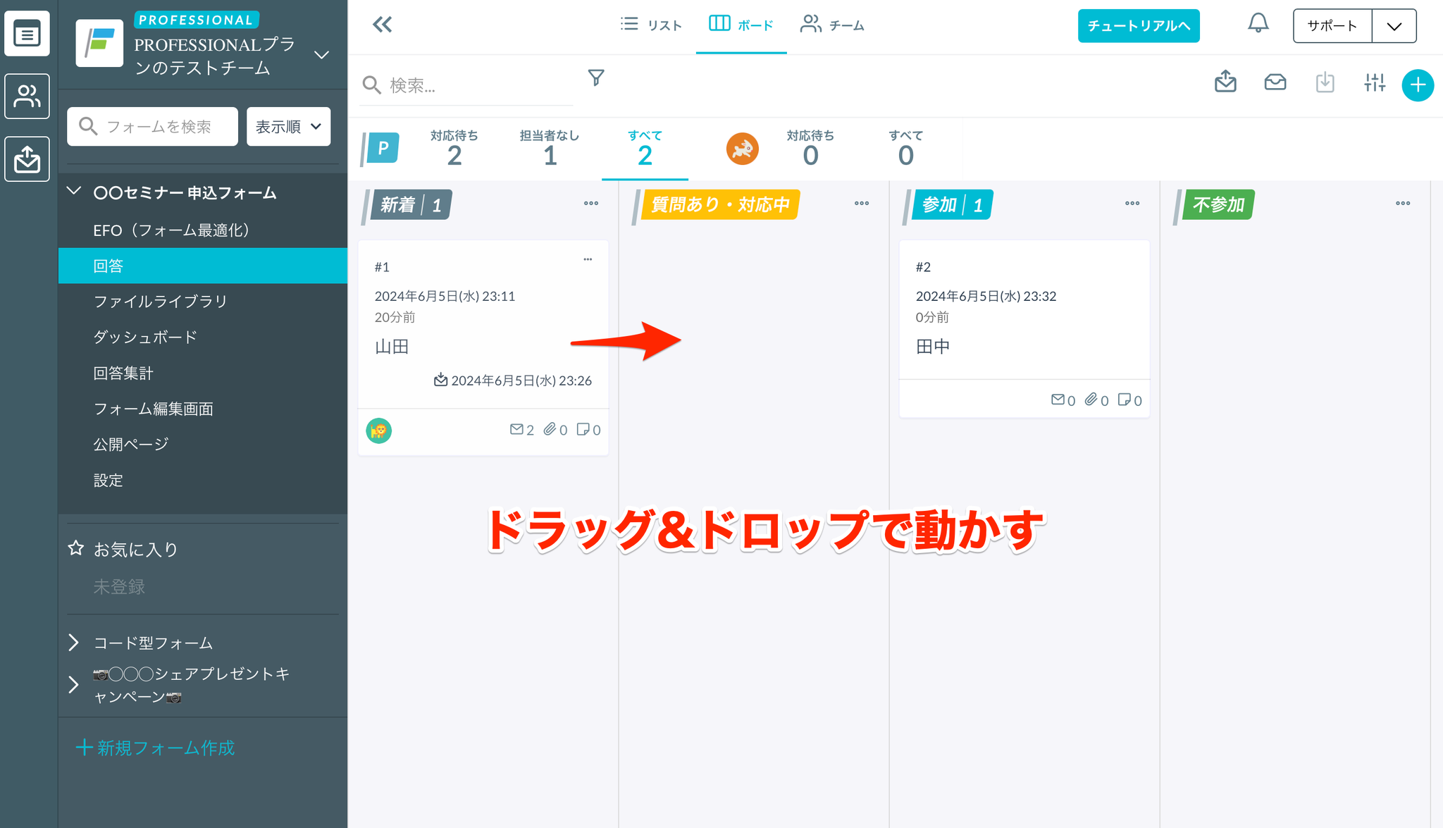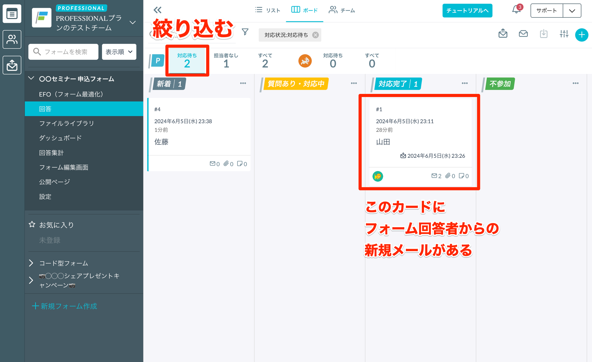 一度メールを送信すると「対応済み」になりますが、フォーム回答者から返信があると「対応待ち」になるため、どのカードに返信があったか一目瞭然です。