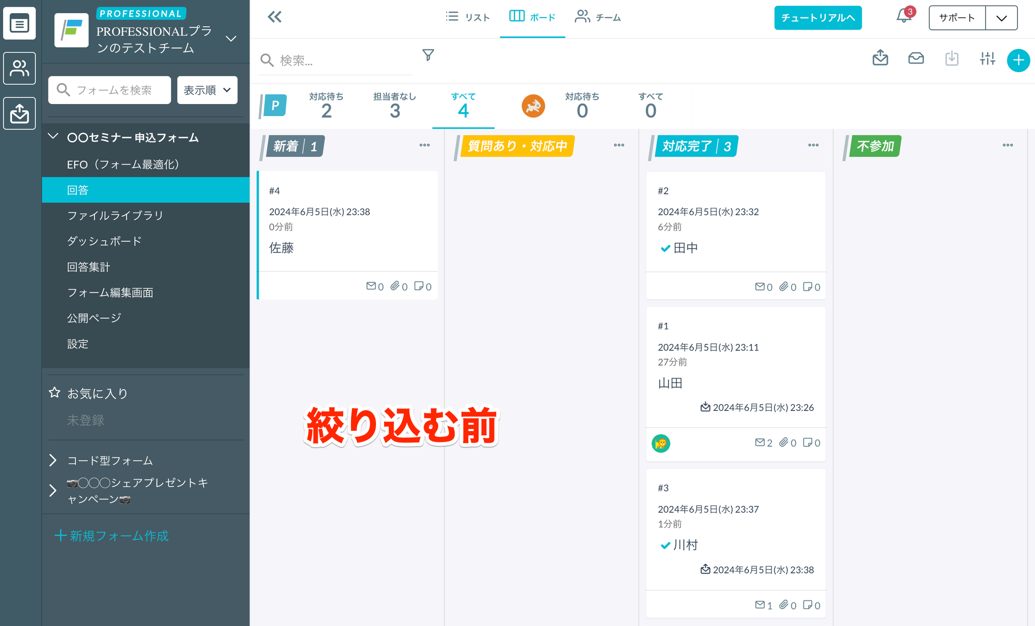 定期的に「対応待ち」でカードを絞り込むと、対応漏れを簡単に防げます。