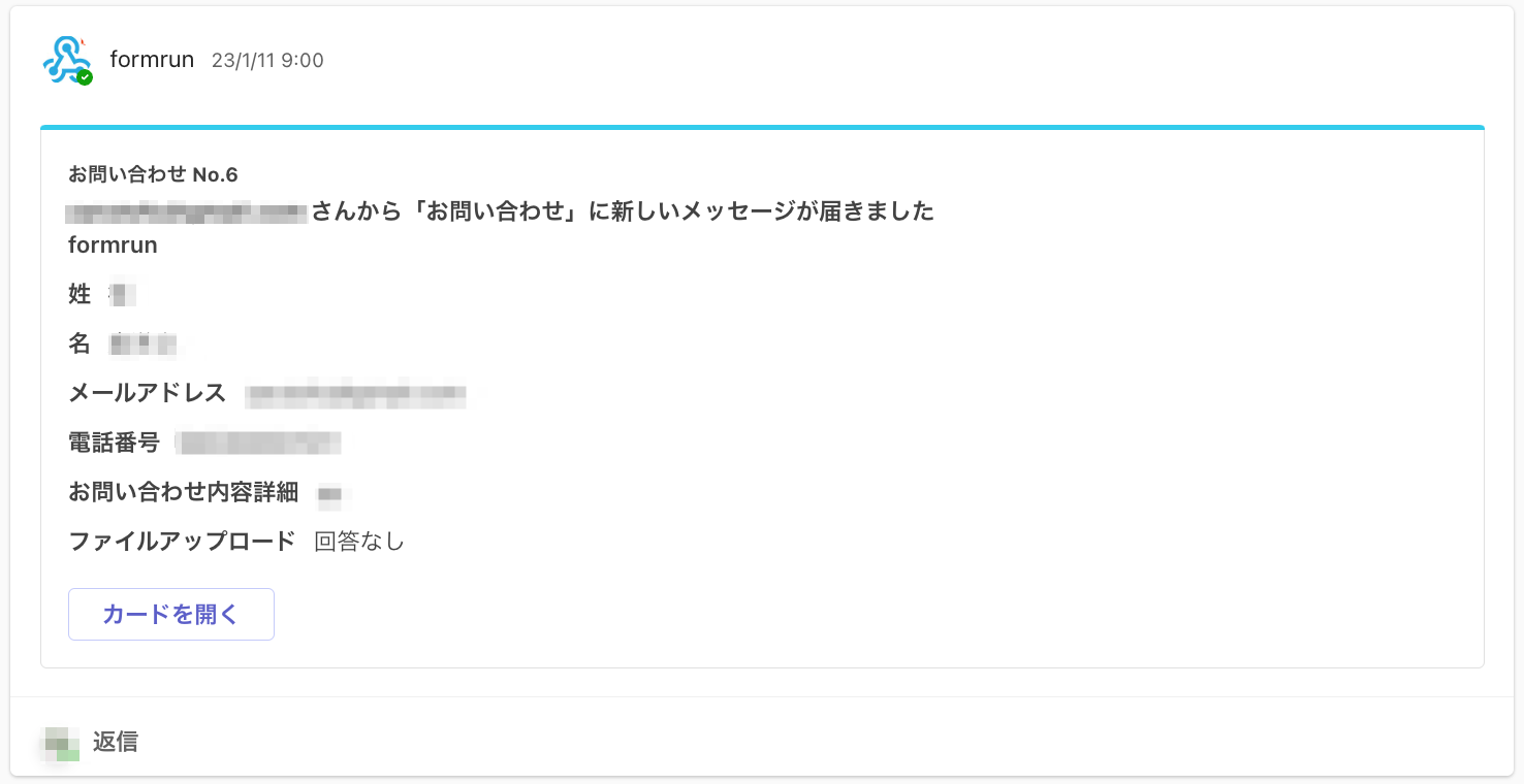 フォームに回答やformrun上でメールの送受信等があった場合に、Microsoft Teamsに通知できる機能です。
