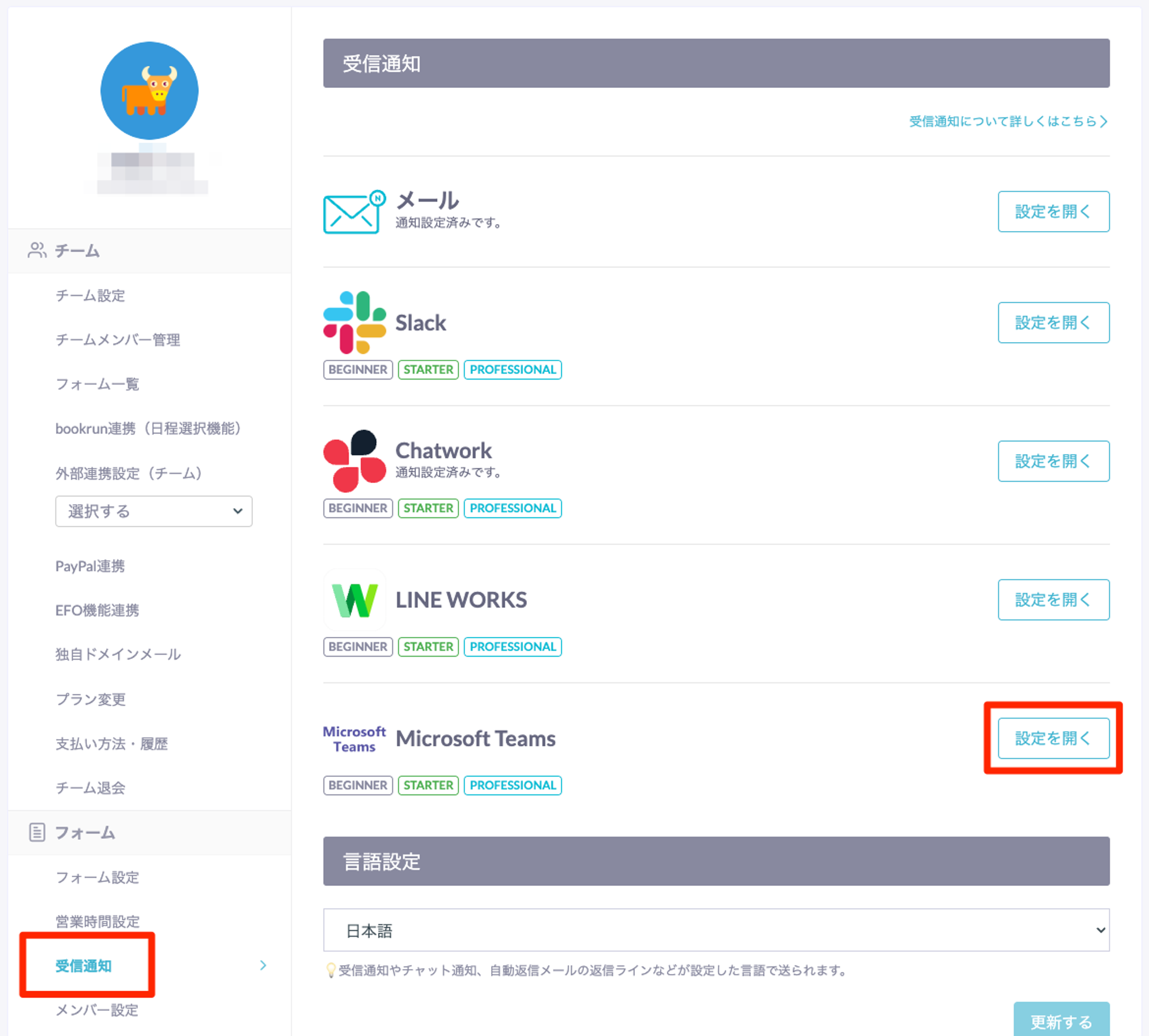 - 設定画面「フォーム>受信通知>Microsoft Teams」より「設定を開く」をクリックする。