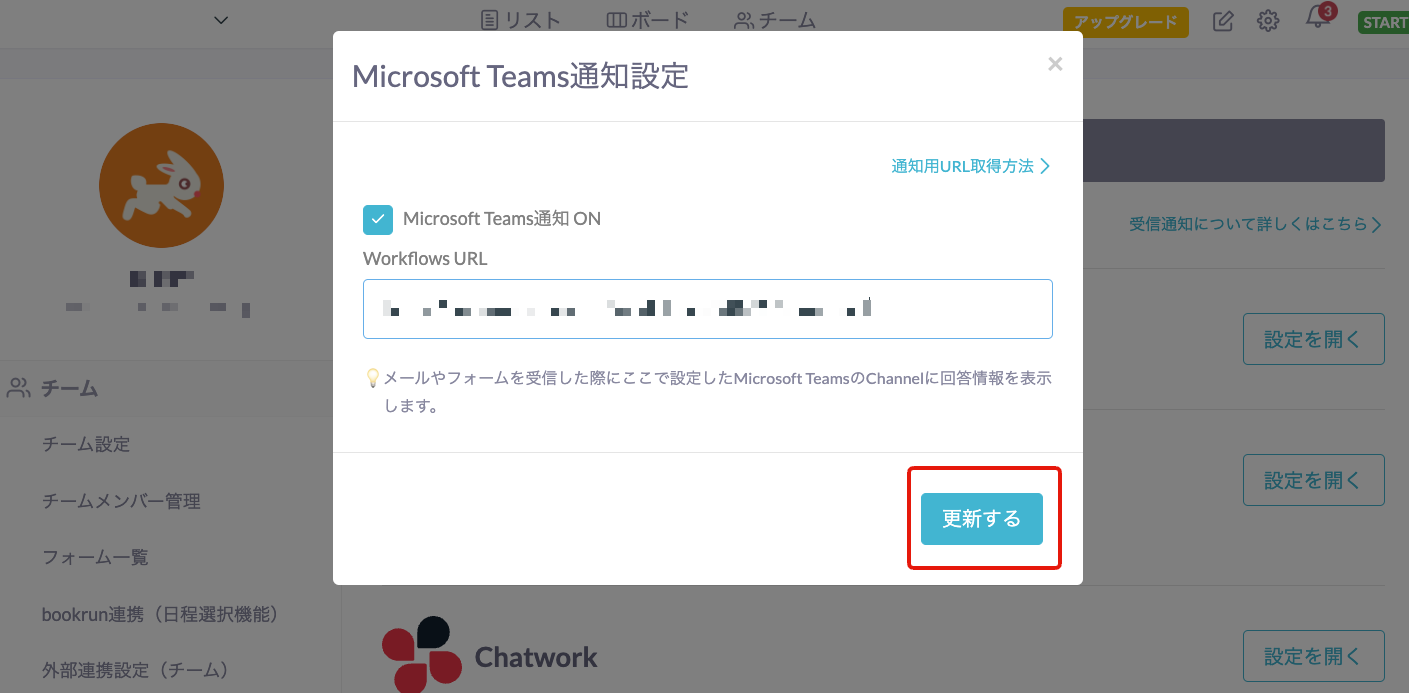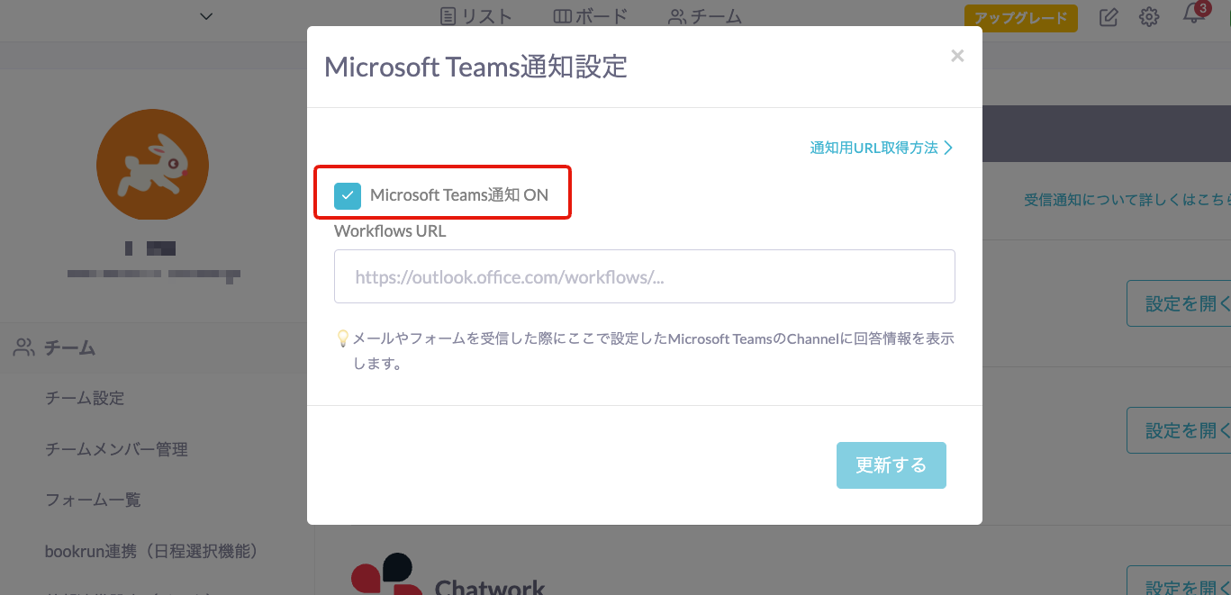 - Microsoft Teams通知設定のモーダルより、「Microsoft Teams通知ON」にチェックを入れる。