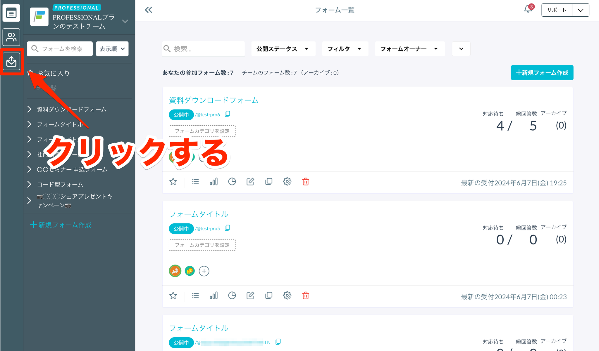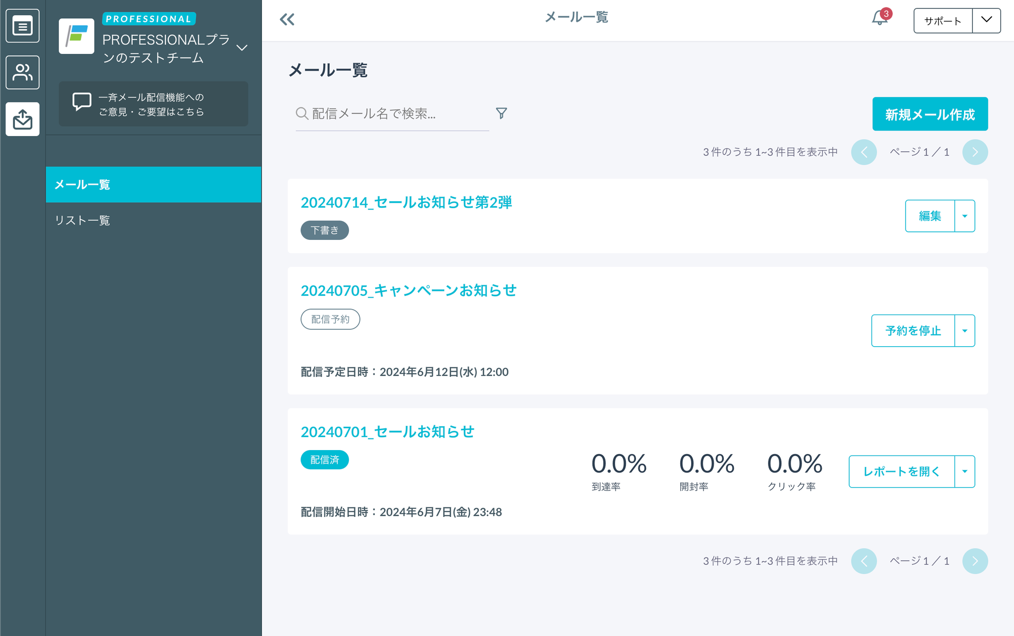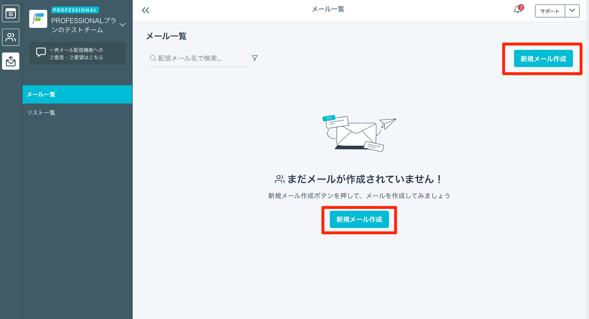 - サイドバーのメールアイコンをクリックし、メール一覧画面に遷移する