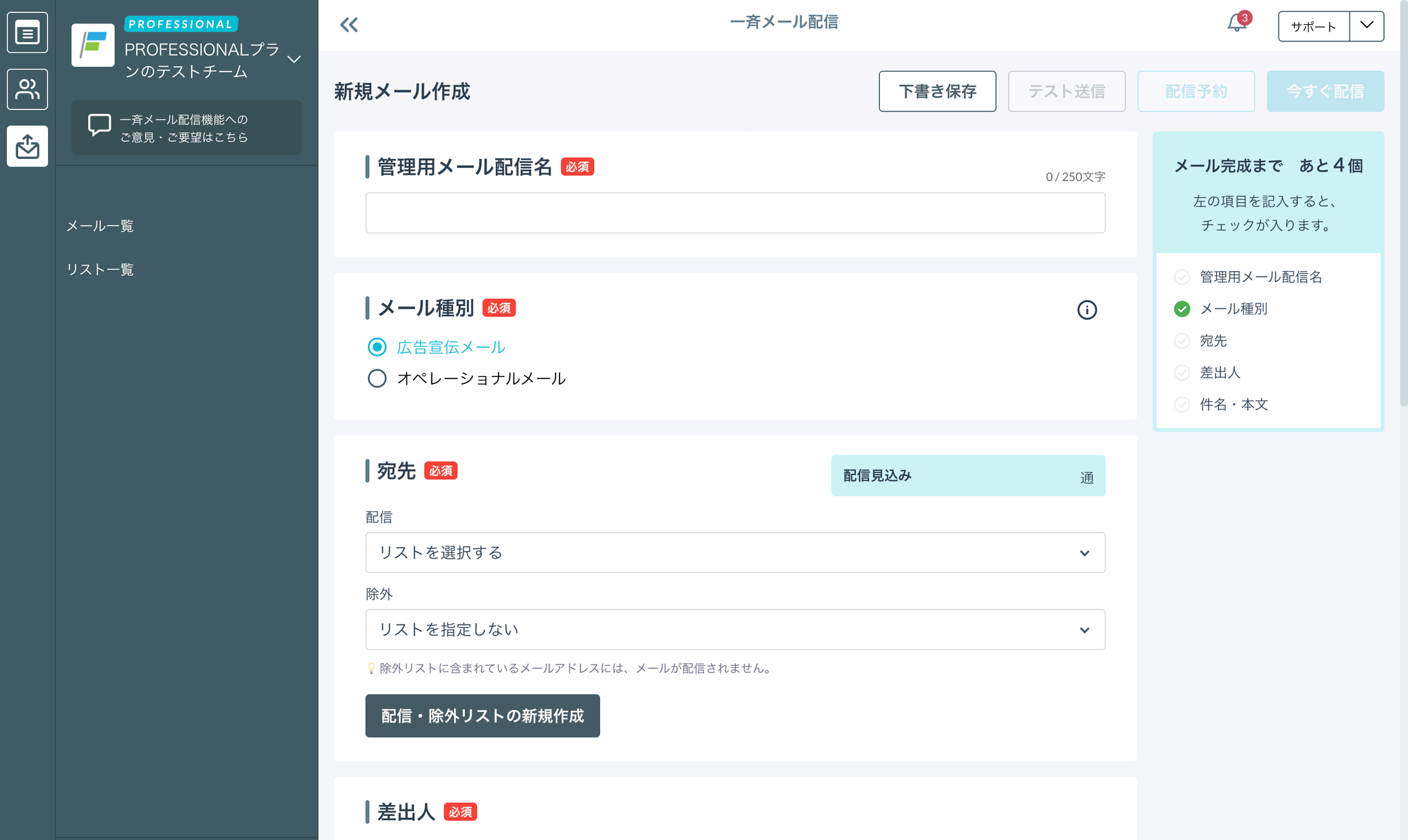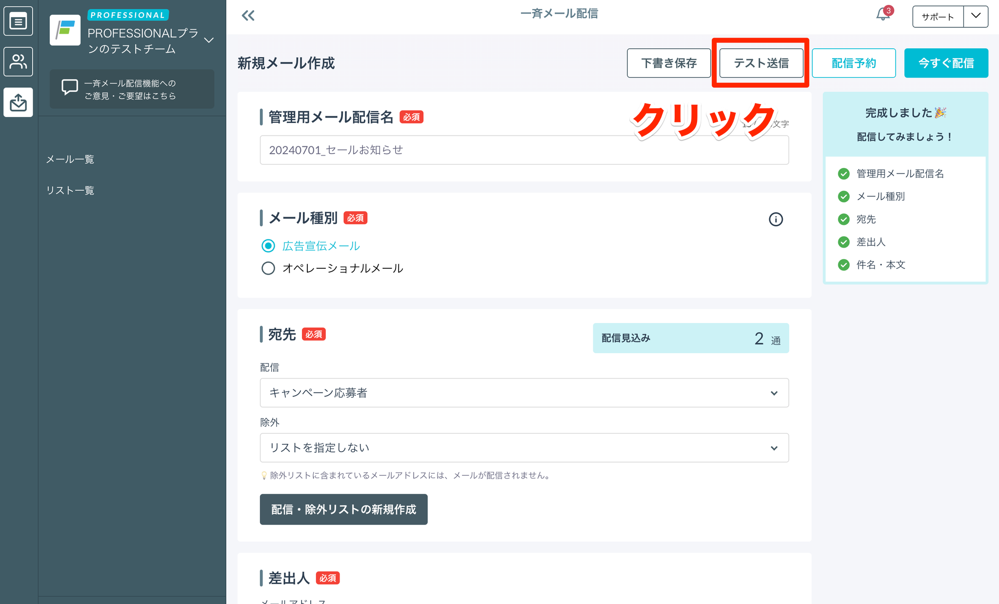 - その場で配信リストを作成し、「メール作成に進む」ボタンをクリック