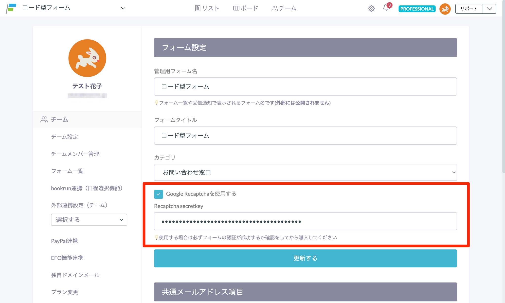- formrunのフォーム設定画面で、「Google Recaptchaを使用する」にチェックを入れ、3.でコピーしたシークレットキーを入力する