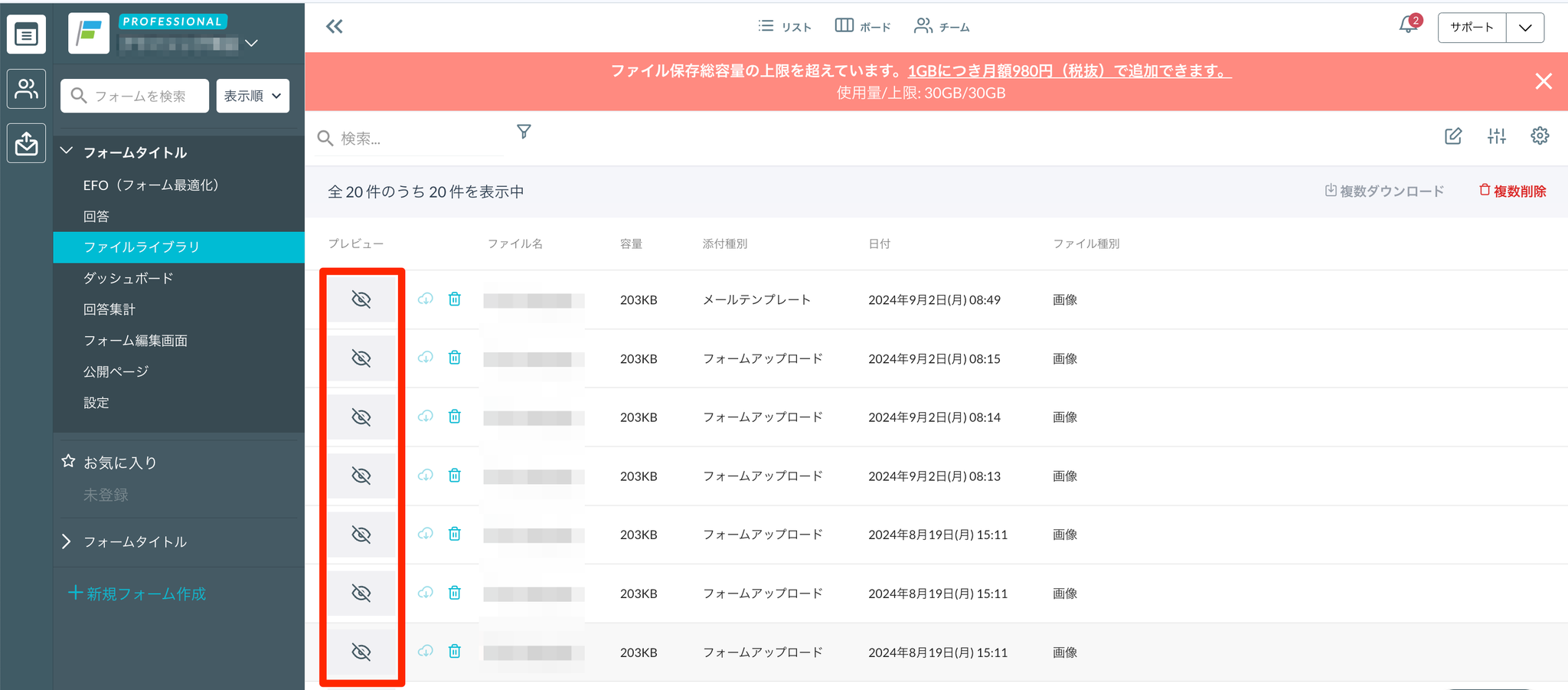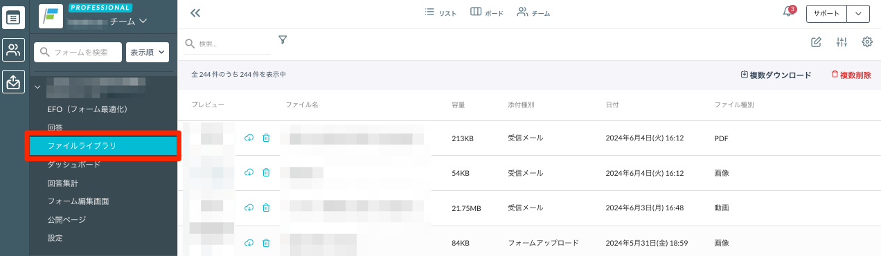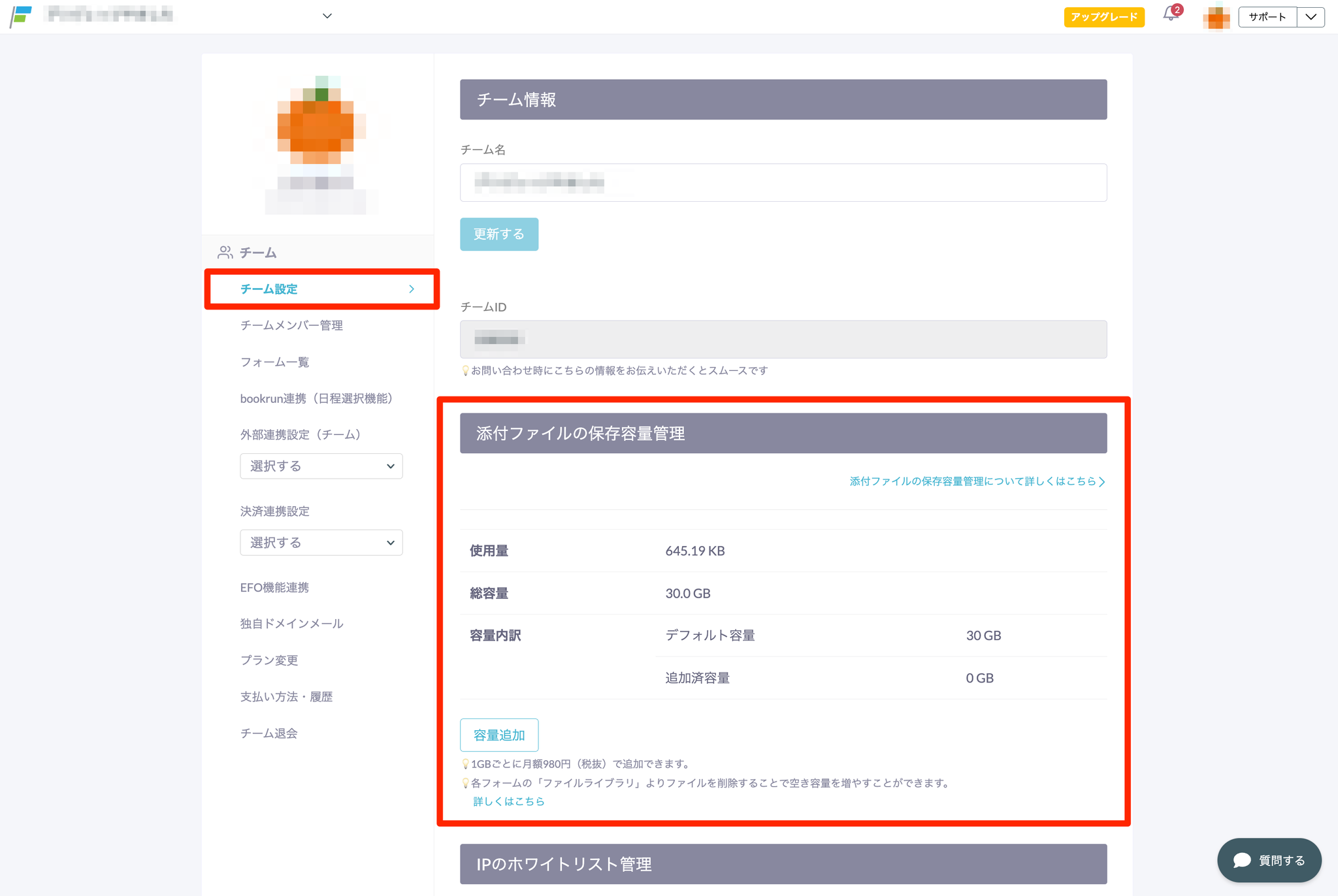 この保存容量はチーム単位で管理され、プランによって上限が異なります。また、添付ファイルは各フォームのファイルライブラリに保存されます。