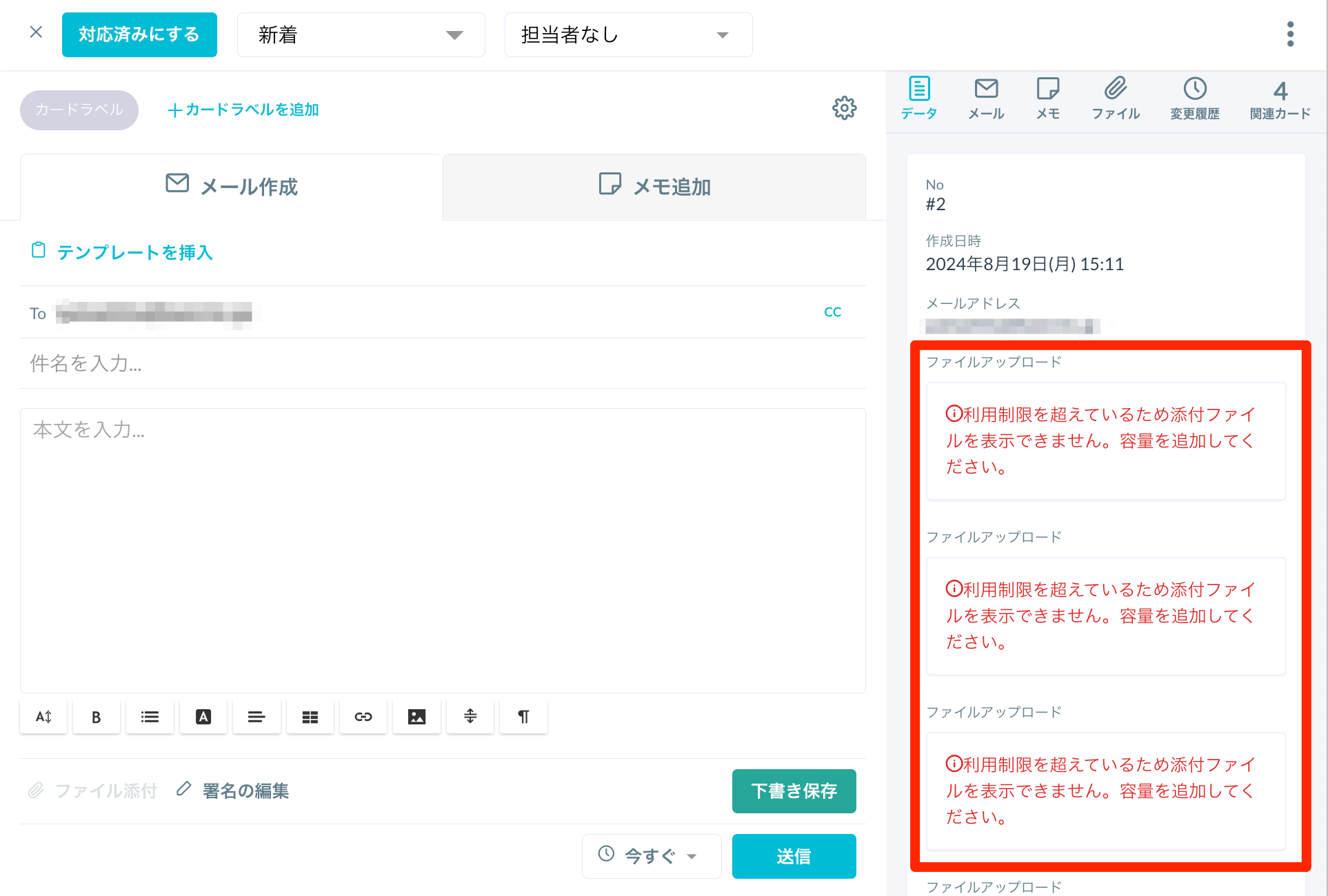 添付ファイルや、ファイルの送受信が行われたフォーム、または、カードを削除し、総容量を制限内まで減らしていただくと、閲覧・ダウンロードが可能です。
