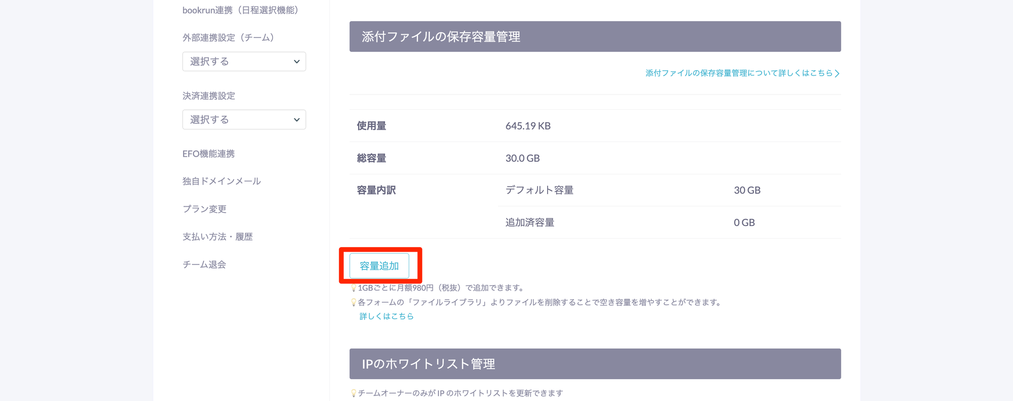 - 設定画面「チーム>チーム設定」の「添付ファイルの保存容量管理」よりご確認いただけます。
