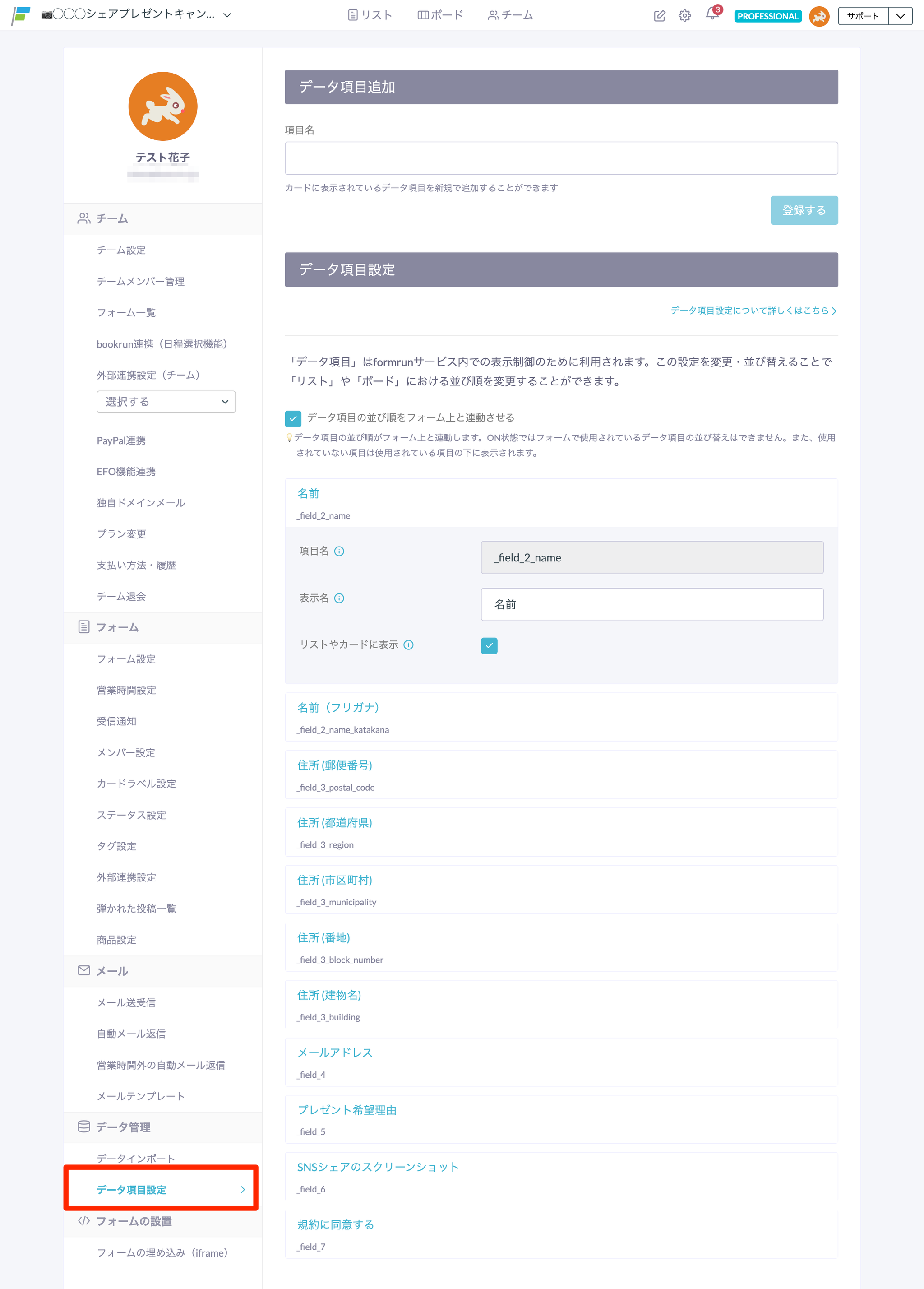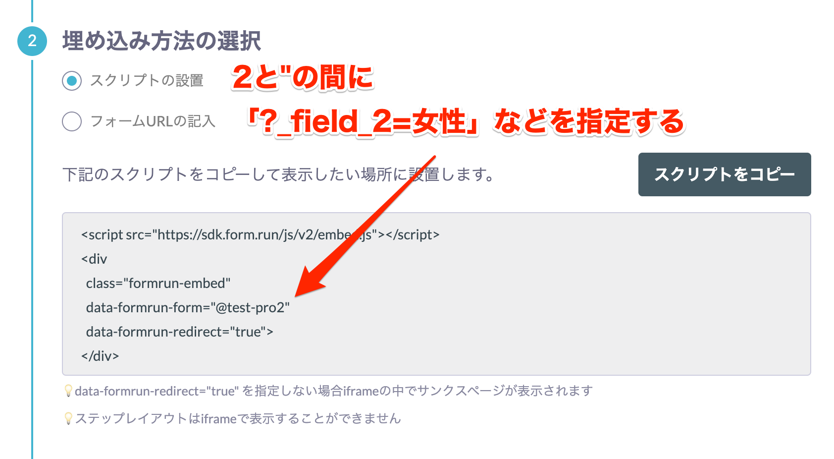 - フォームURLの末尾に、パラメータを付与する 例えばメールアドレス項目に「example@example.com」を指定したい場合は、「https://form.run/@test-pro2?_field_4=example@example.com」と指定します