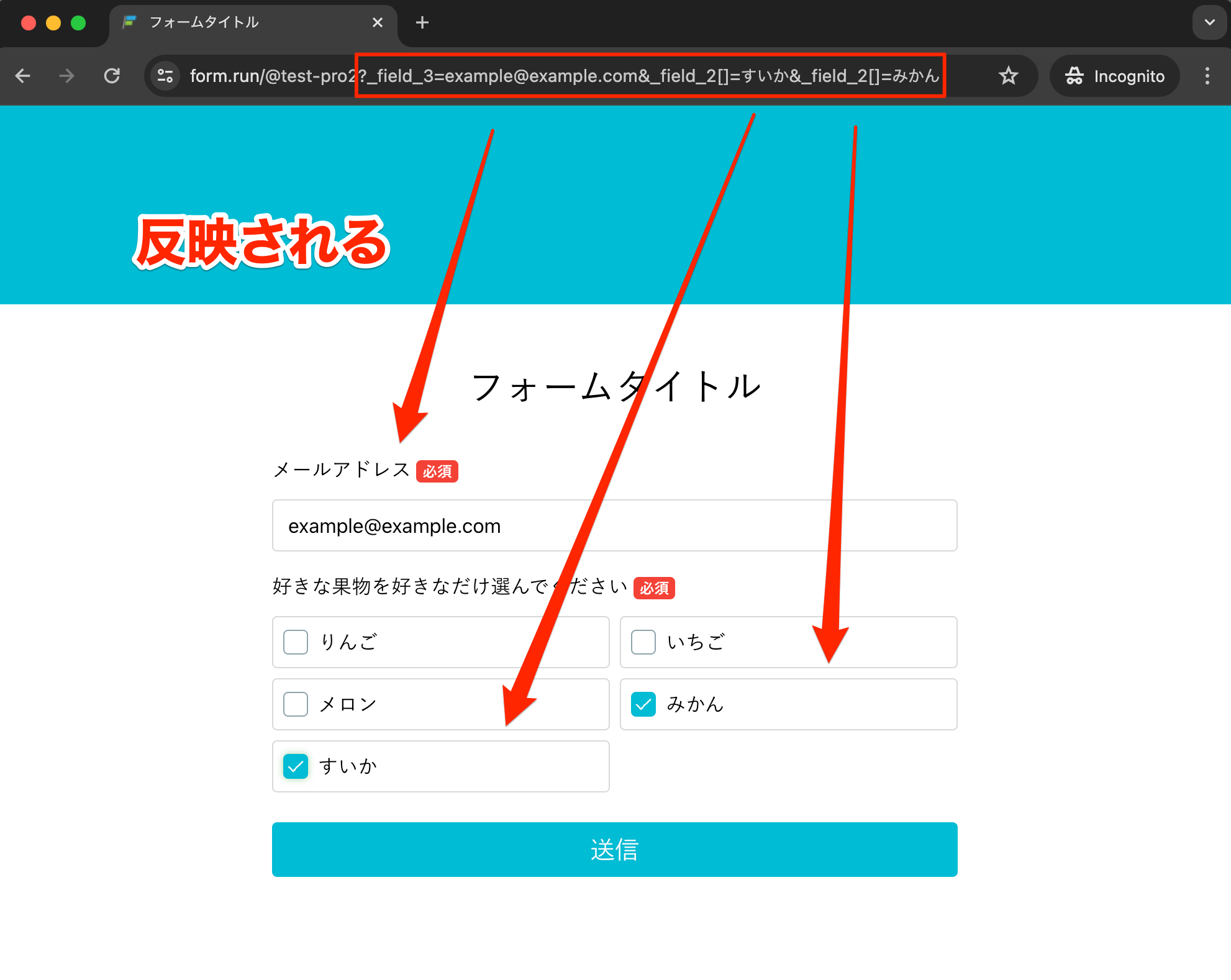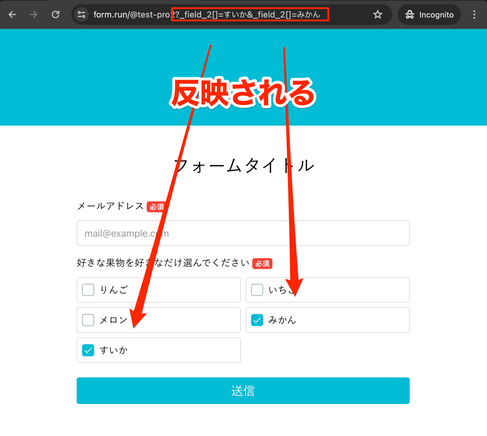 「https://form.run/@XXXXXXXX?_field_N=example@example.com&_field_X[]=選択肢1&_field_X[]=選択肢2」と指定します。