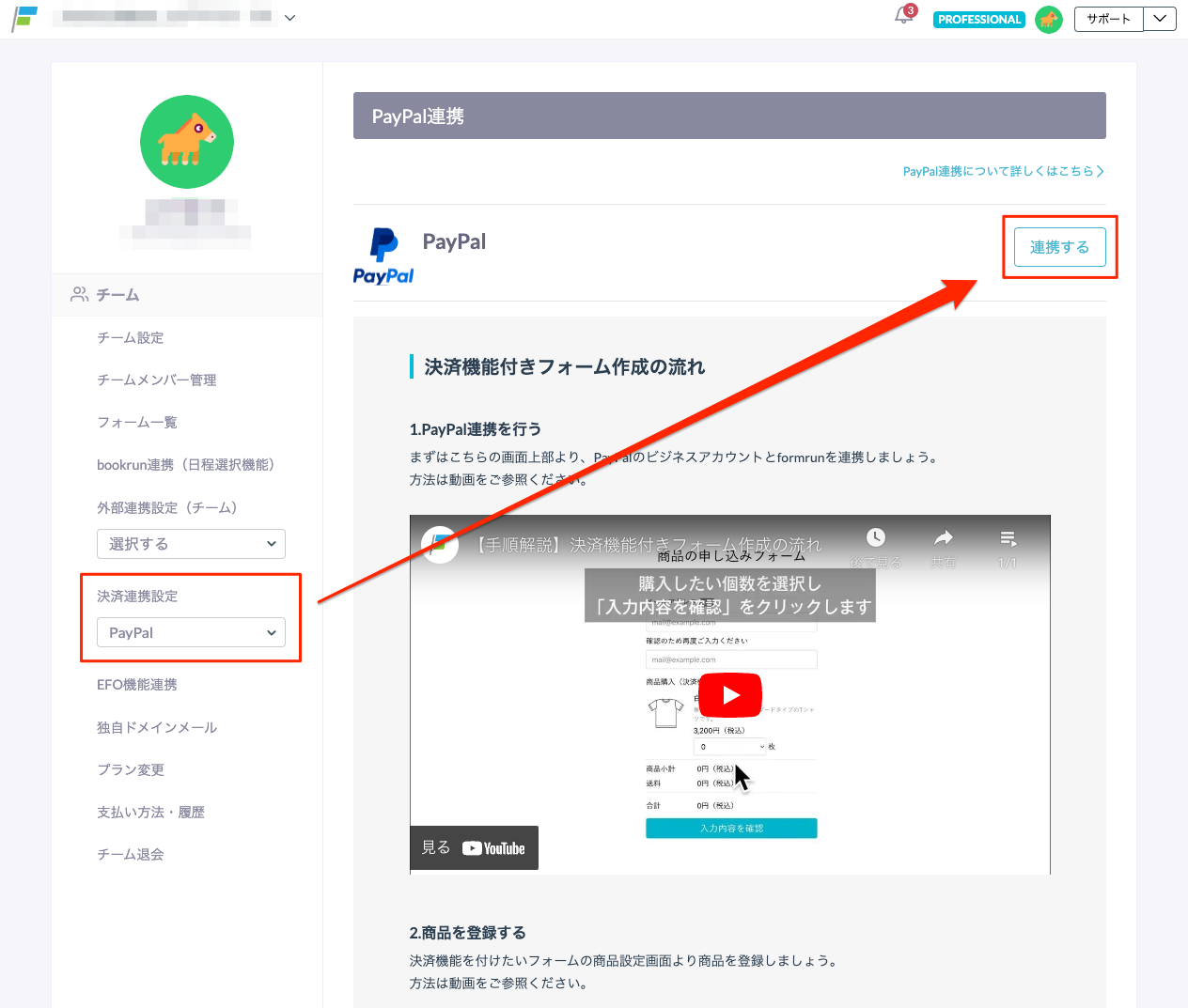 左メニューの「決済連携設定」から「PayPal」をクリックし、「連携する」をクリックします。