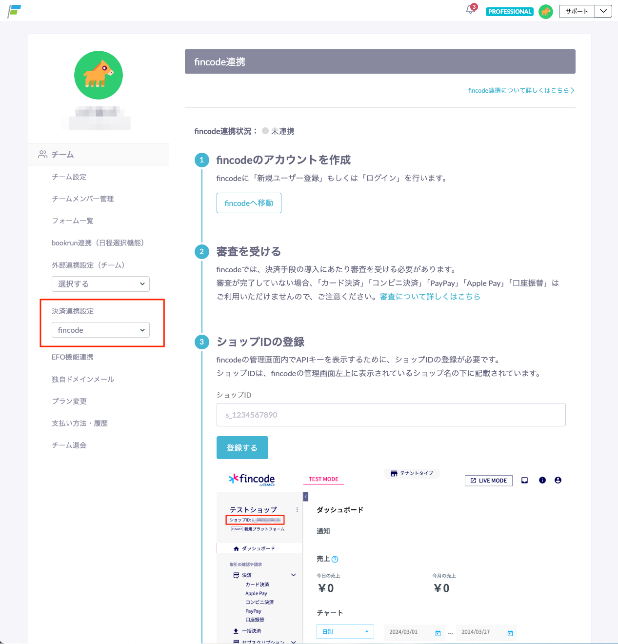 左メニューの「決済連携設定」から「fincode」をクリックし、アカウント作成から記載の手順の通りに進めます。