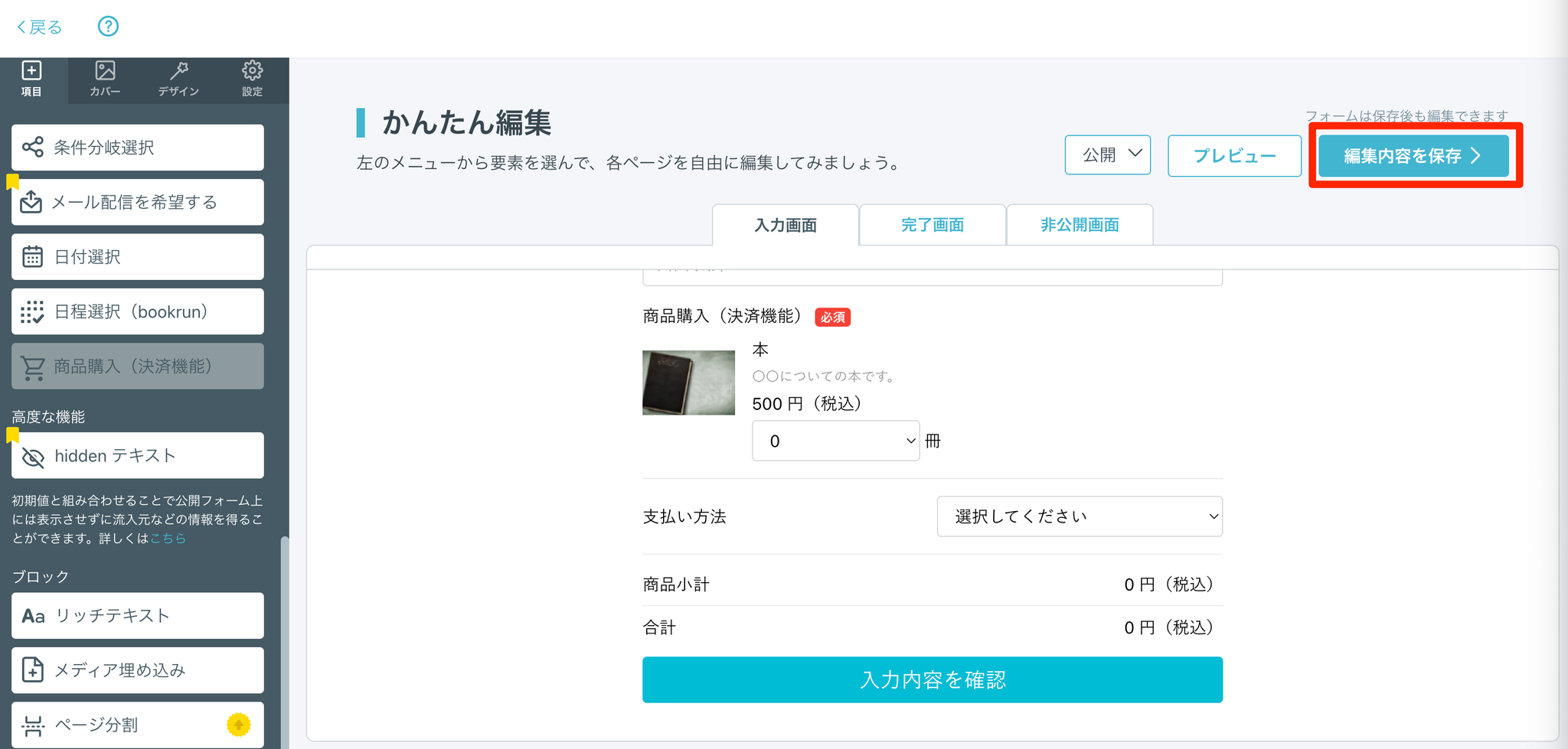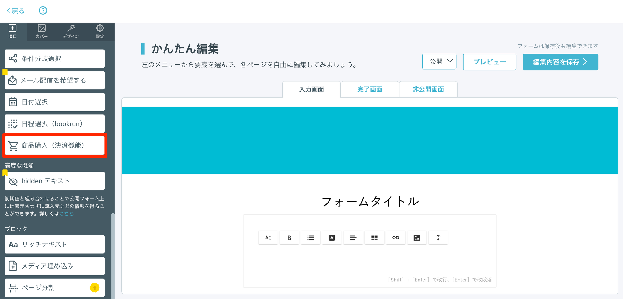 項目タブより「商品購入(決済機能)」項目を追加し、フォームに表示したい商品を選択します。