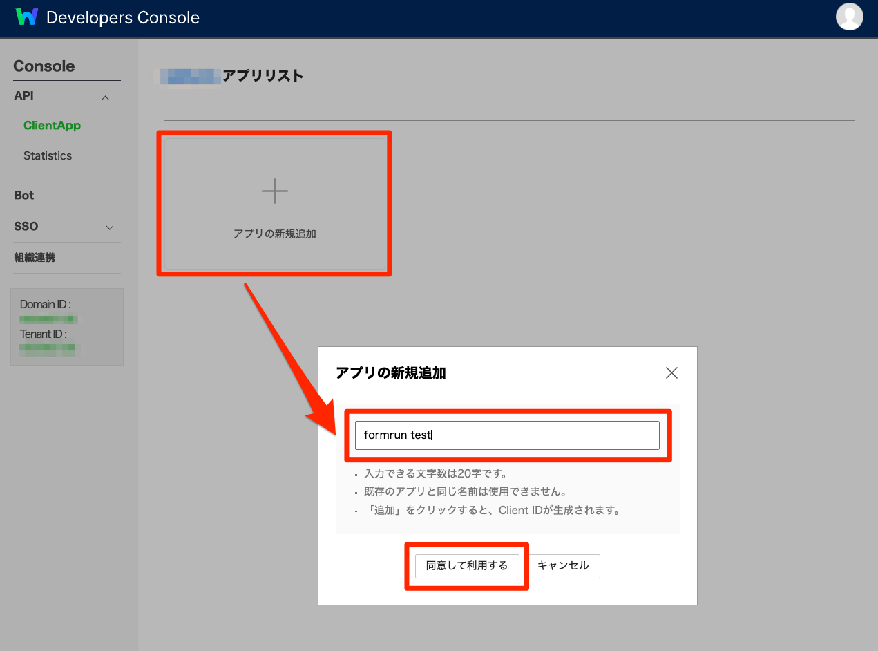 - 「アプリの新規追加」より、任意のアプリ名を追加し「同意して利用する」をクリックする。