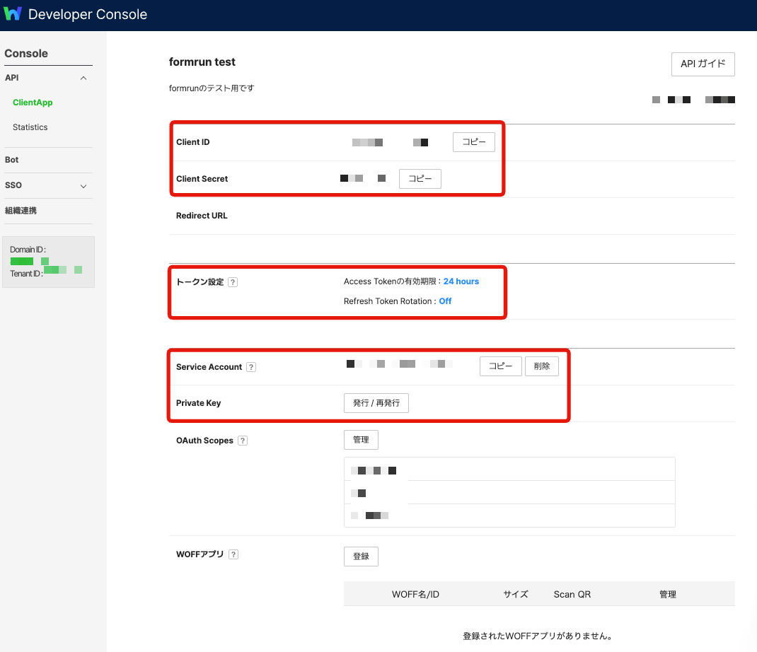- 「Client ID」「Client Secret」「Service Account」「Private Key」を取得する。
