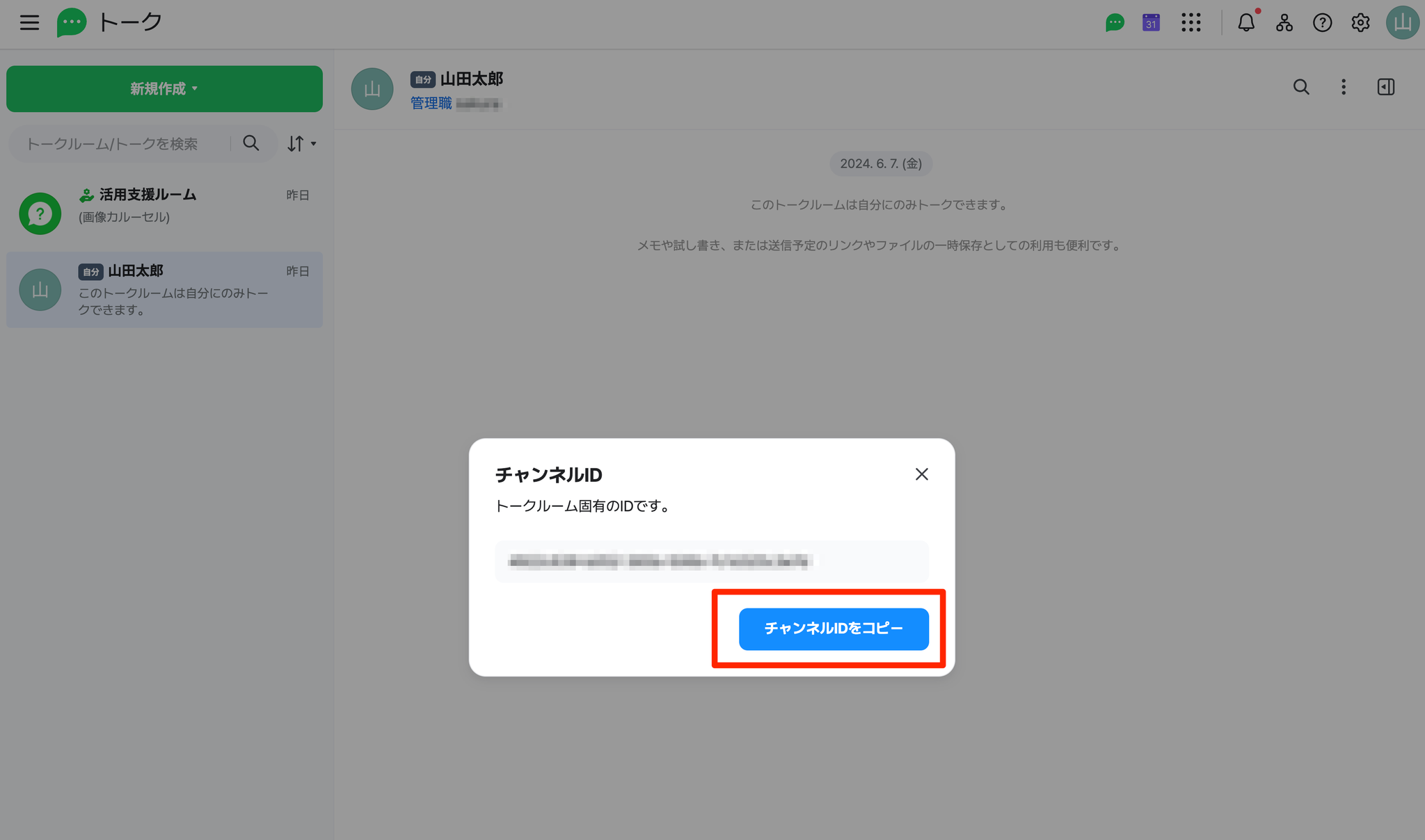 - トークを開き、画面右上の「⋮」をクリックし「チャンネルID」をクリックする。