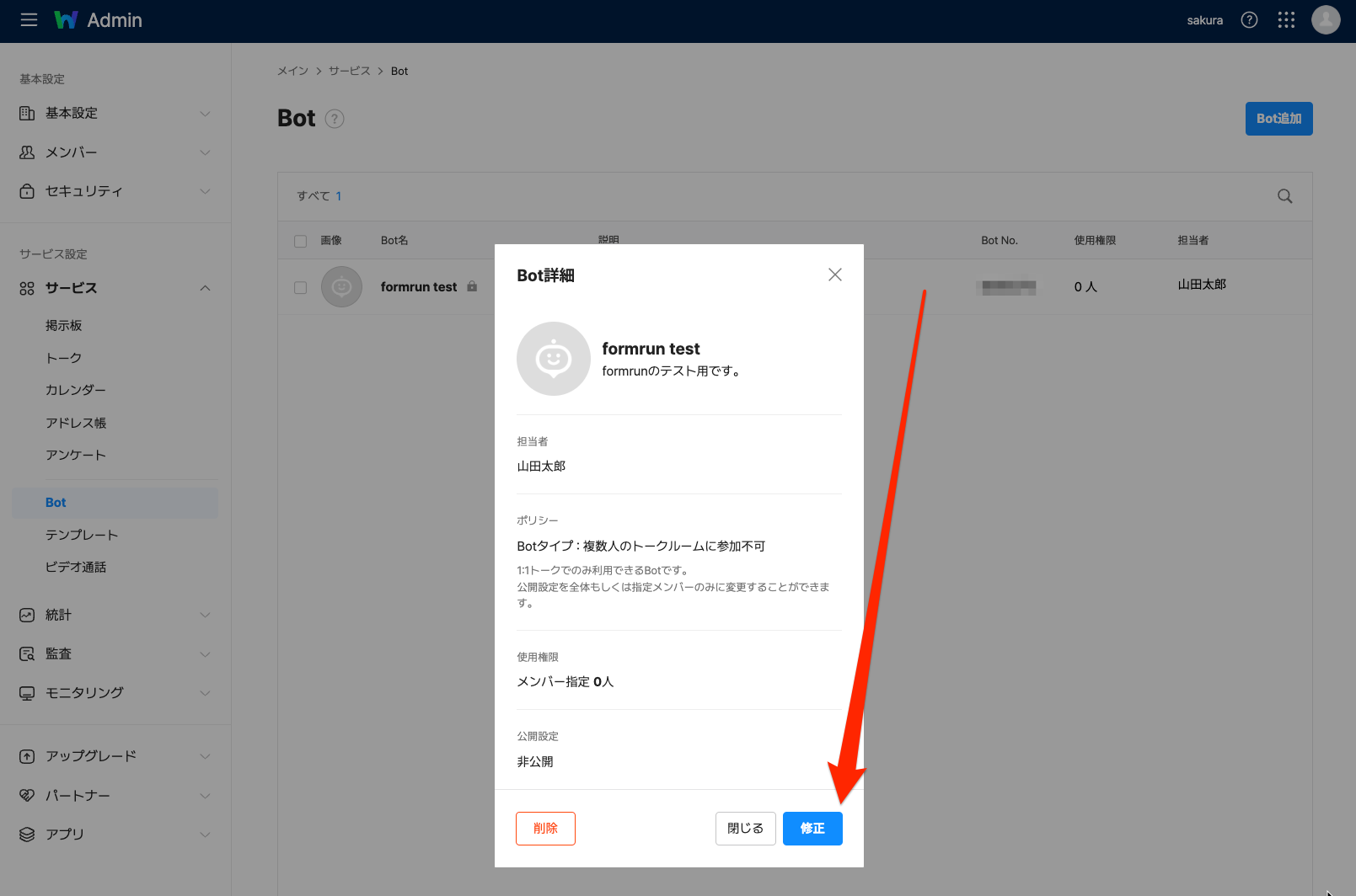 - 追加したBotを再度選択し、Bot詳細モーダルにて「修正」をクリックする。