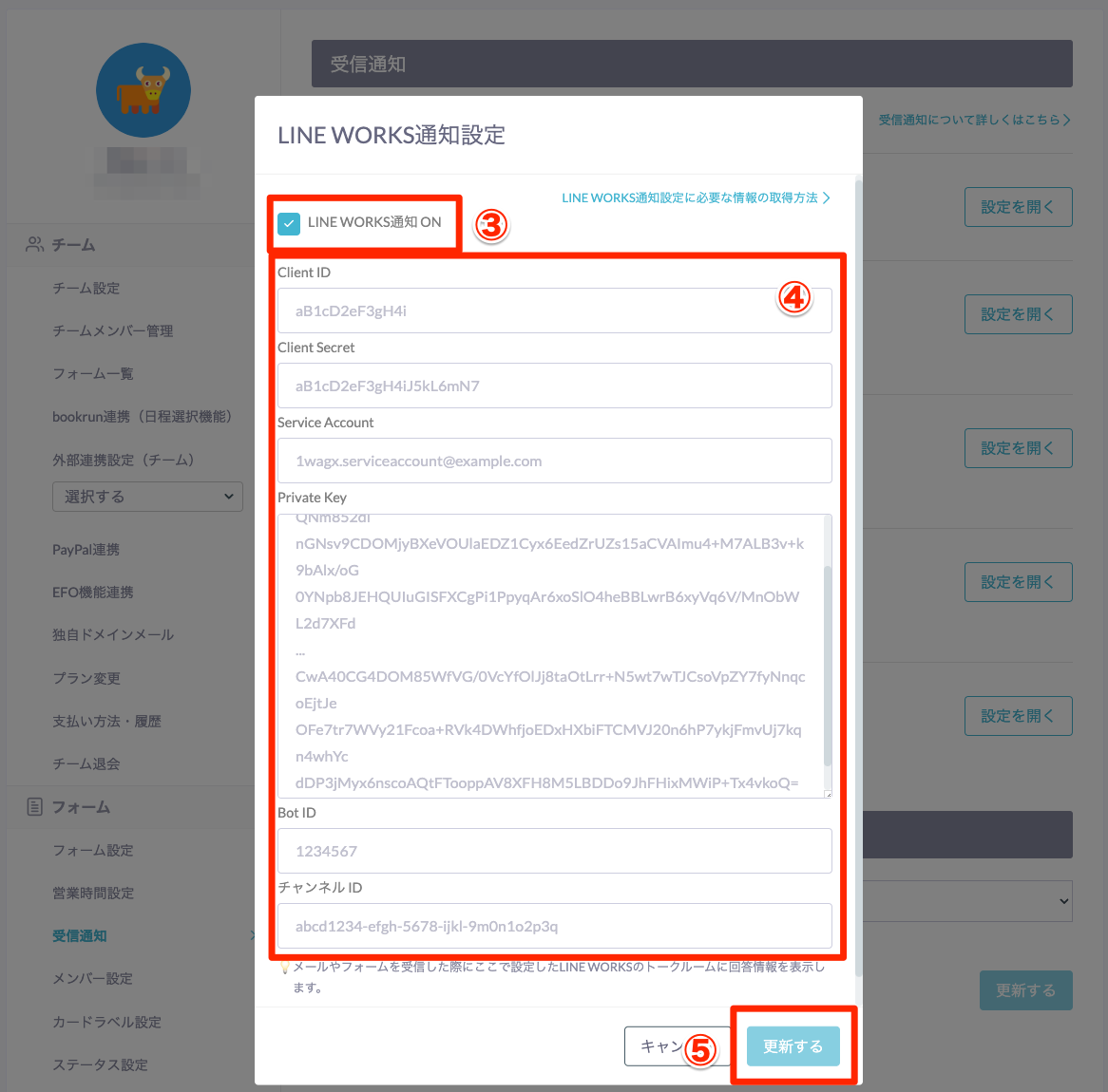- LINE WORKS通知設定のモーダルより、「LINE WORKS通知設定ON」にチェックを入れる。
