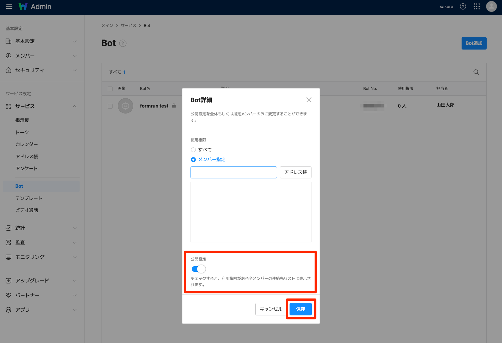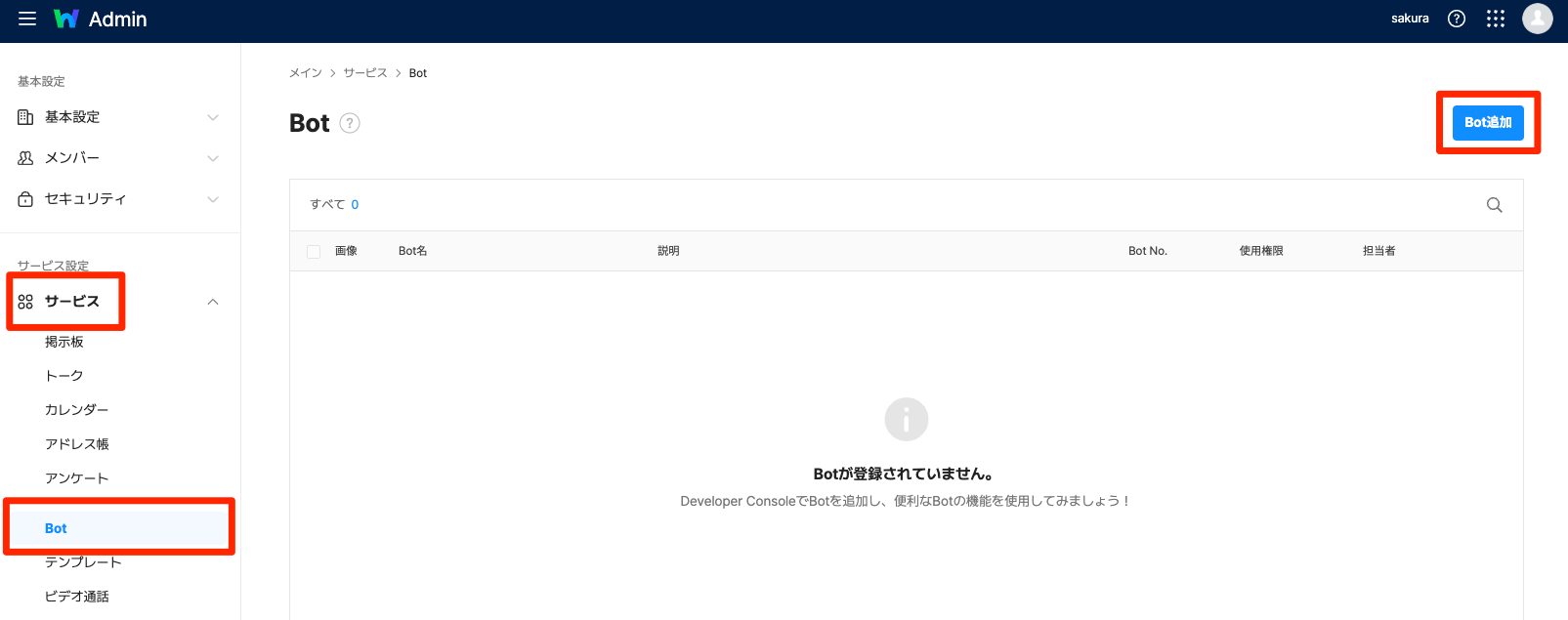 - サービス設定「サービス>Bot」より「Bot追加」をクリックする。