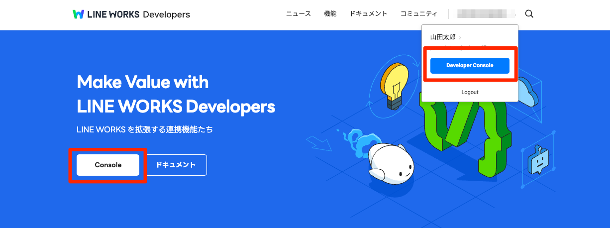 - 利用規約に同意し「利用する」をクリックし、LINE WORKS Developer Consoleに入る。
