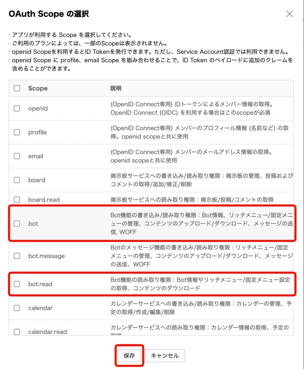 - 「OAuth Scopes」にて、「bot」「bot.read」にチェックをいれ、Botの利用を有効にする。