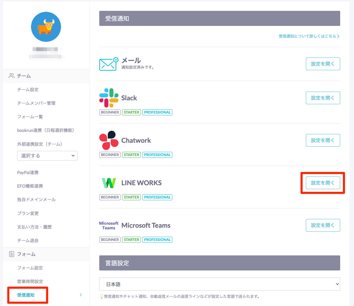 - 設定画面「フォーム>受信通知>LINE WORKS」より「設定を開く」をクリックする。
