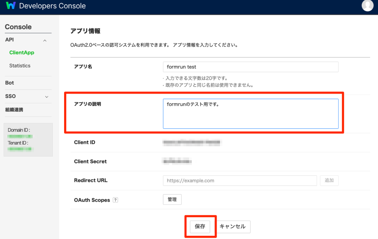 - 「アプリの説明」を入力し、「保存」ボタンをクリックする。