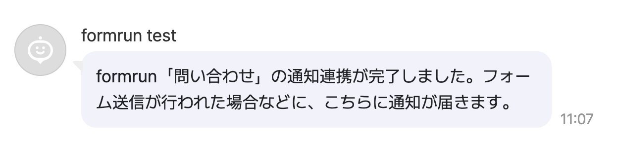 正しく連携された場合、自動的に以下の画像のようなテスト通知が送信されます。