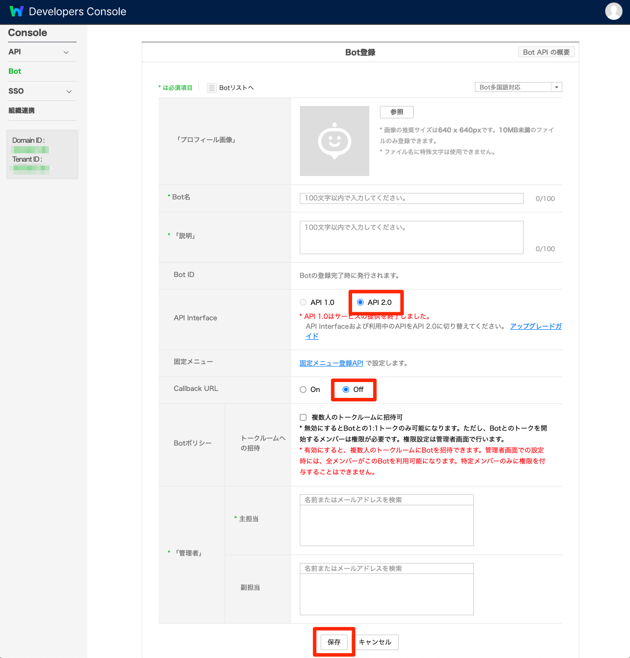 - 必須項目を記入し、保存する。 ※「API Interface」はAPI 2.0、「Callback URL」をOffを選択してください。