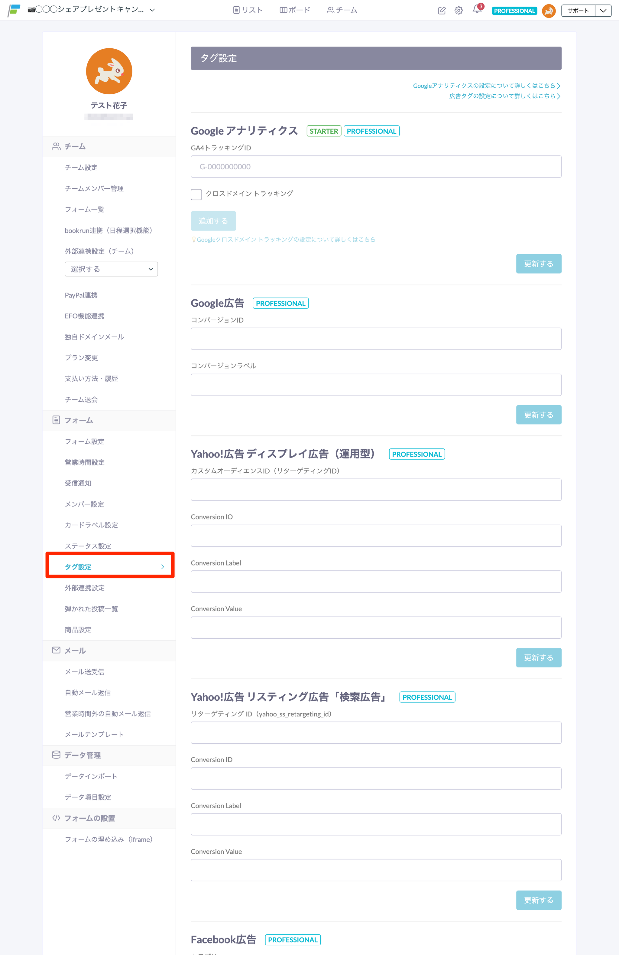 formrunの管理画面上からではなく、ご自身で用意された画面側に広告タグをご設定ください。