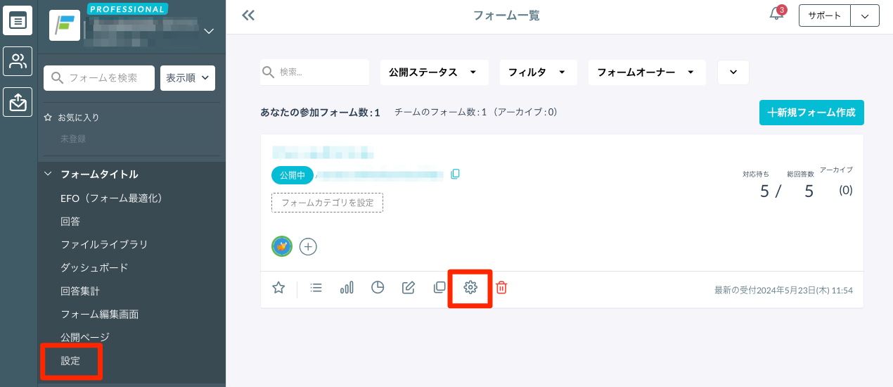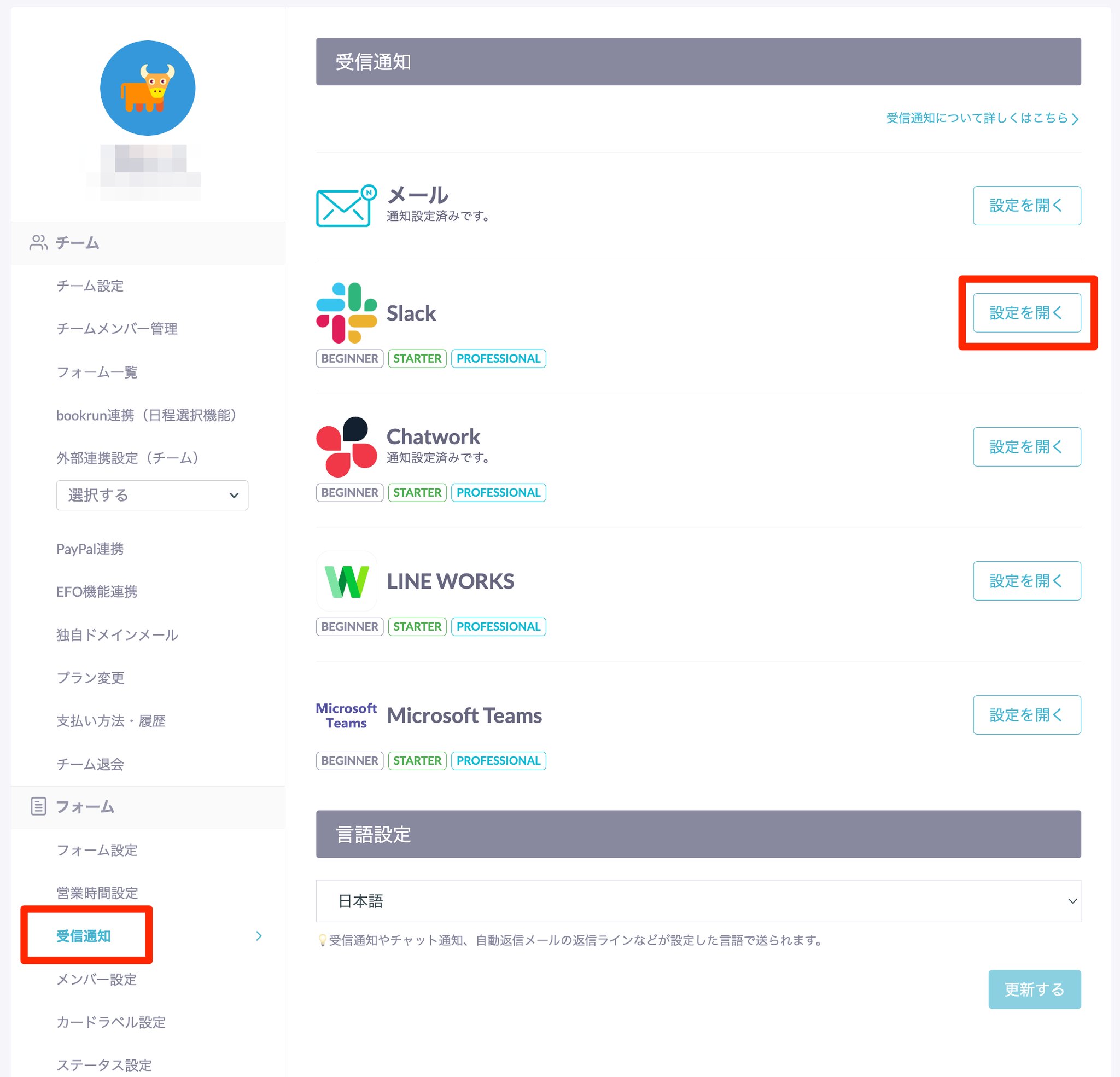 - 設定画面「フォーム>受信通知>Slack」より「設定を開く」をクリックする